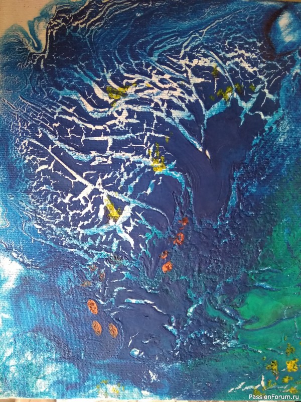 Ириша, мне очень нравятся такие эксперименты, сама на них заглядываюсь, а моя младшая уже пробовала, подскажи, что добавляешь из силиконовых добавок. Вот эта ее картина мне очень нравится, получился естественный кракелюр. И как морское дно