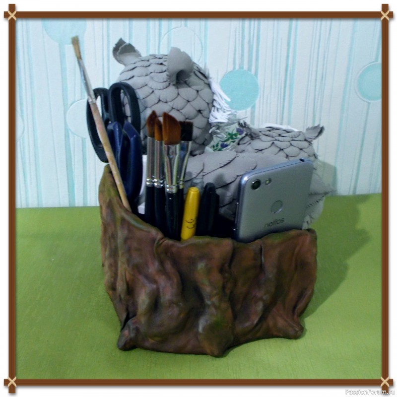 Дорогие друзья! Сегодня официально сообщили,что моя работа--эльфик из фоамирана--получил призовое место в конкурсе " В гостях у сказки"! И всё это благодаря всем вам,кто поддержал эту работу своими голосами!!! Огромное СПАСИБО вам!!! Это мой первый конкурс подобного плана и очень приятно,что он принёс мне такие результаты! А теперь хочу показать завершение работы над композицией по МК Светланы Владимировой.Самих совушек я уже показывала,а теперь пришло время усадить их на пенёчек,в котором есть место и для ручек-кисточек и для телефона или записной книжки.Диаметр пенька 20 см.Всё из фоамирана.