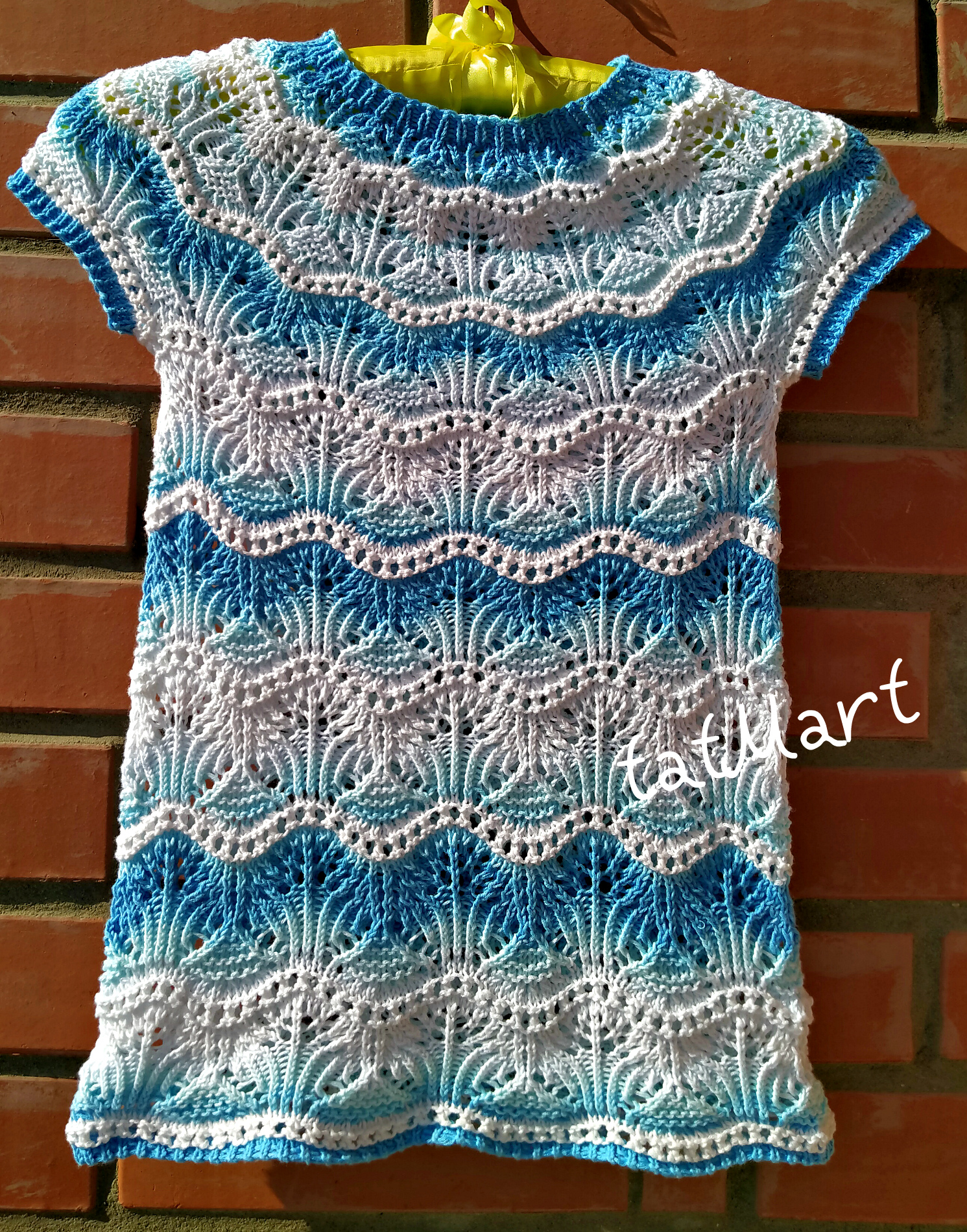 подарочек для моей модельки, которая гостит сейчас у бабушки. Поэтому фото сессия будет позже. Итак, туника " BLUE WAVE" японским ажуром, вязала по кругу снизу вверх. Легко и быстро. Общий вес 148 грамм на возраст 5-6 лет. Была не большая заминка по времени, не хватило белой ниточки , буквально 10-15 метров