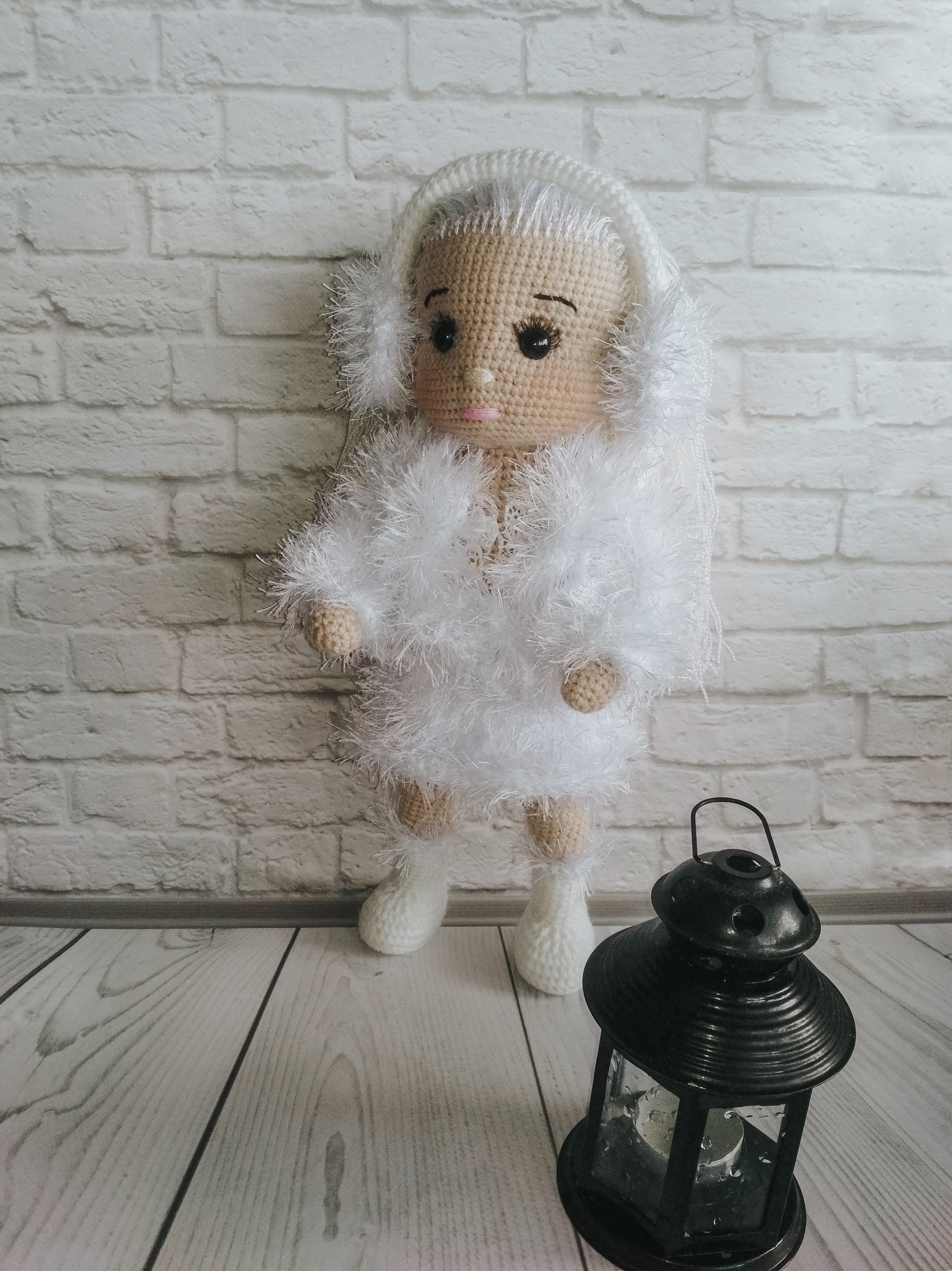 Интерьерная куколка будет чудесным подарком! С нетерпением ждёт свою хозяйку! Девочка связана крючком. Рост 35 см. Всё тело на проволочном каркасе - всё сгибается. У малышки длинные волосы из синтетических ниточек. Шапочка-наушники и шубка связаны из белой пряжи травка. Одежда (трусики, топик, шубка, наушники) снимается. Трусики и топик сшиты из белой ткани и кружева. Глазки пластиковые, ресницы приклеены. Цена 3500рублей