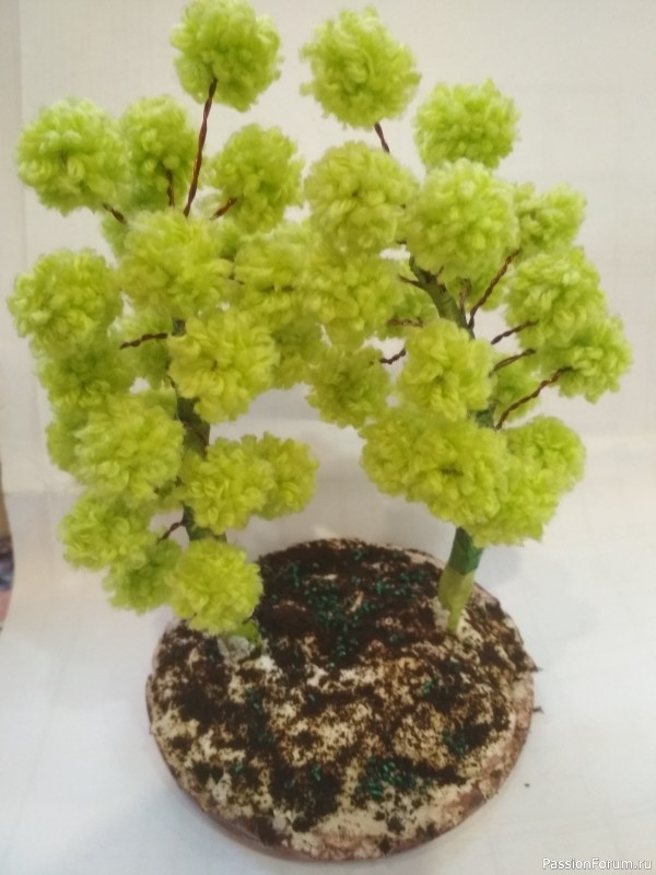 Пришла мысль у меня сделать вот такие пушистики-деревья.Делала маленькие помпоны,на тонкую проволоку и на основе проволока потолще,обмотала крип-лентой,на гипс,посыпала использованный высушенный чай(гранулы) и бисер, закрепила лаком для волос.