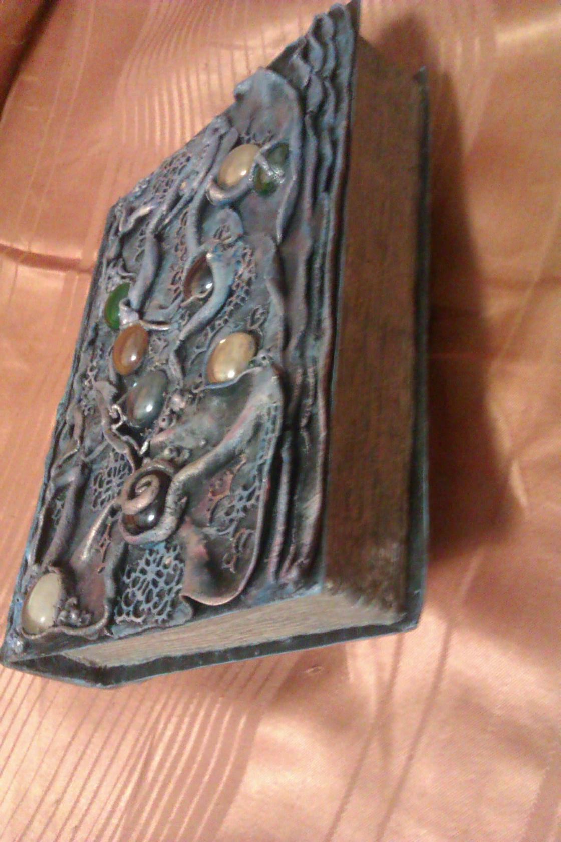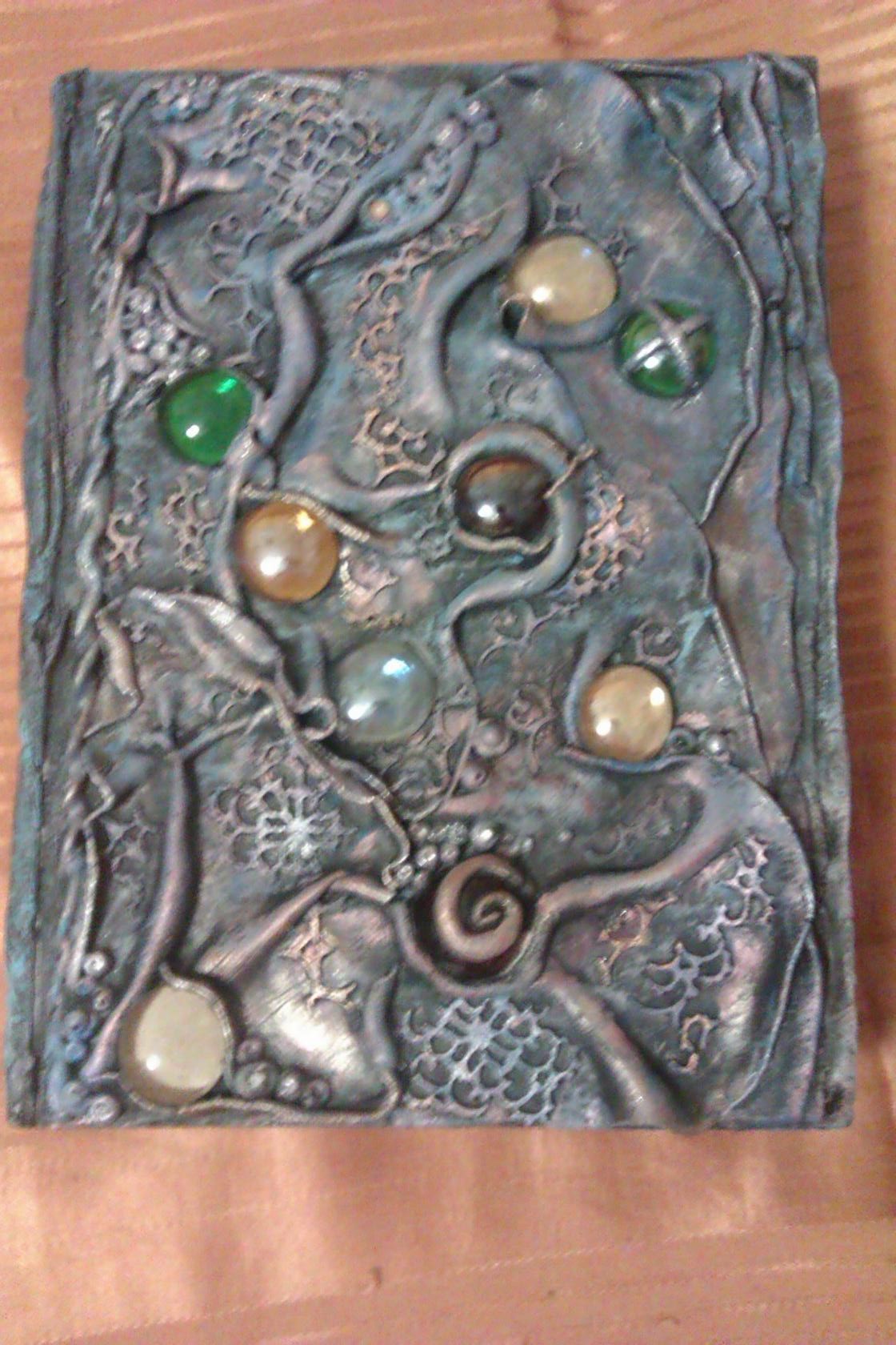 шкатулка -книжица выполнена на основе обычной книги. Страницы выпали а переплет остался хорошим. Декорирована глиной, камнями и оттисками что были под рукой.