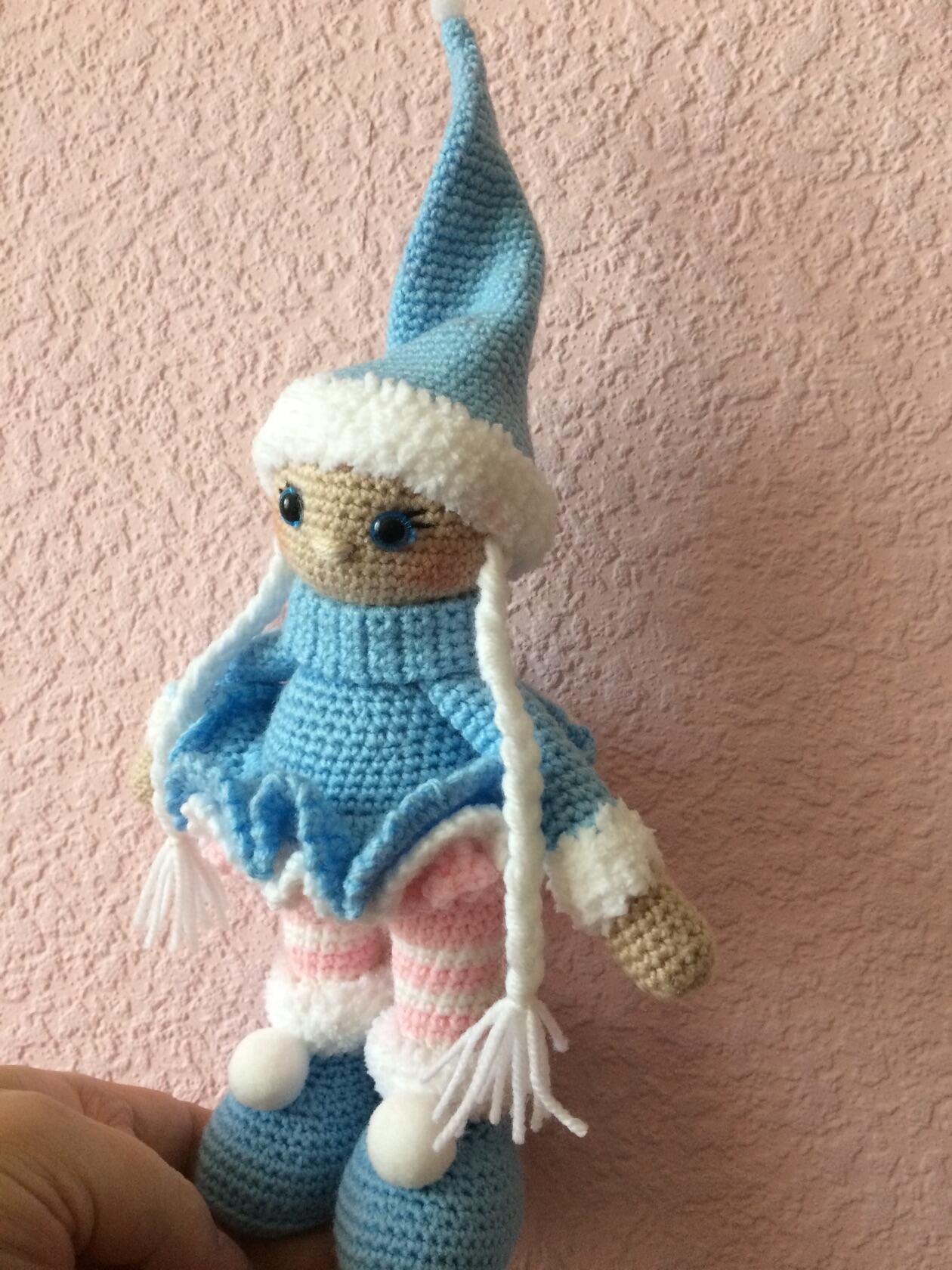Куколка связана из детской пряжи крючком.