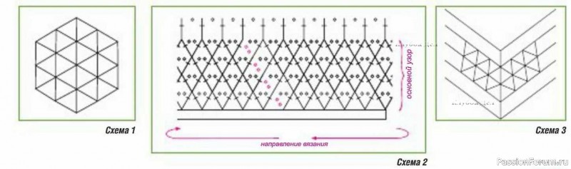 Кофточку тоже нужно вязать по кругу, чтобы рисунок на берете и на кофточке не отличались друг от друга. Провязать столбиками без накида 8 рядов, затем перейти на основной узор как показано на схеме 2.