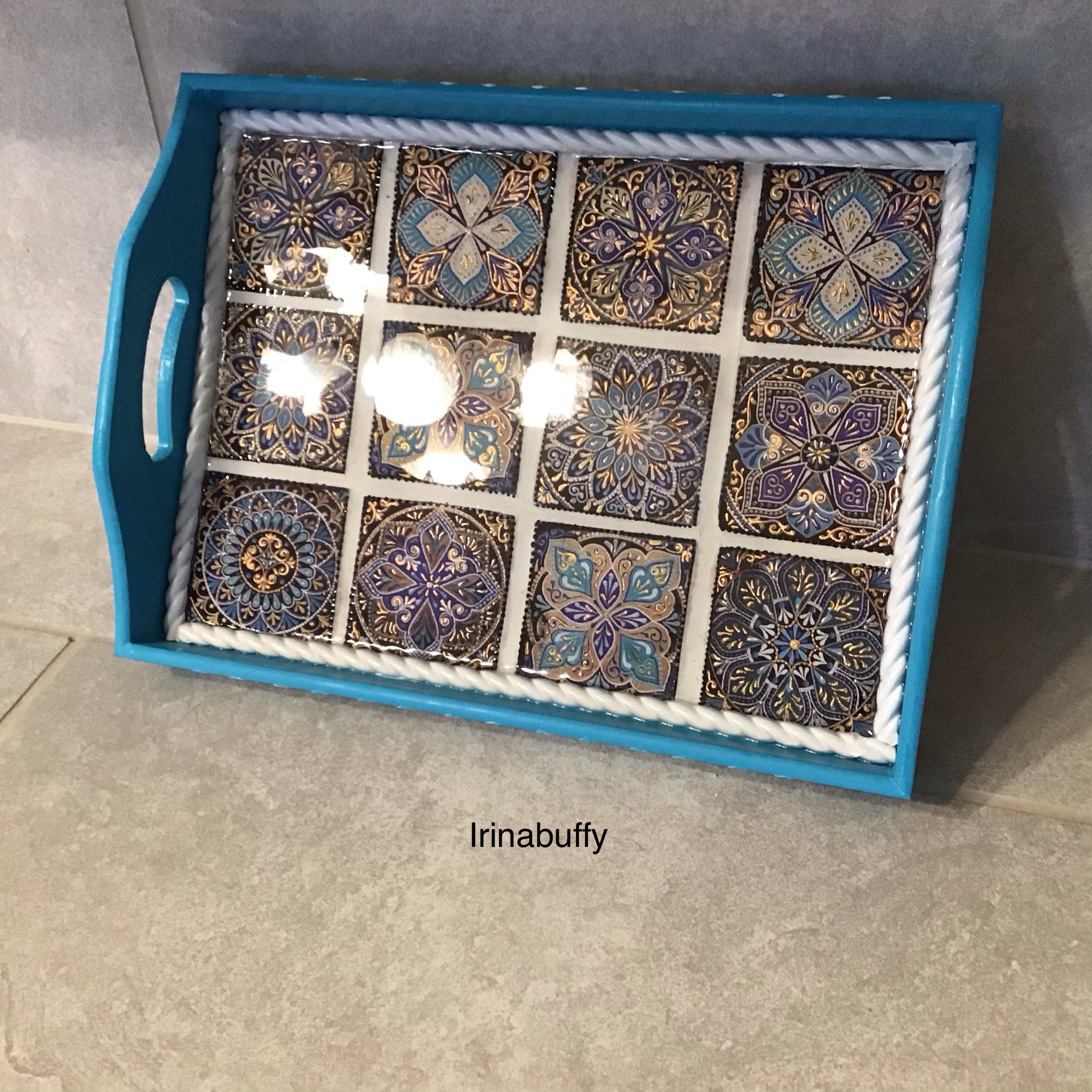 Добрый всем день!Решила усложнить себе задачу и сделать поднос с самодельными плиточками.заготовка подноса из фанеры.Плиточки делала из самозатвердевающей глины.Толщину формировала через пасту -машину,примерно 3-4 мм,обрезала металлической линейкой и канцелярским ножом.После просушки подшпаклевала трещинки( а они появились), отшкурила и покрыла лаком,затем приклеила распечатки.Получилось 12 плиток.Сам поднос покрасила и нанесла подходящий трафарет шпатлевкой.Плитки приклеила на ПВА.После просушки промежутки между плиток заполнила шпатлевкой.Разрисовала золотым и чёрным контуром кое-где рисунок плиток.По периметру подноса -молд из Леруа.Просушила поднос в течение суток и залила эпоксидный смолой.Рада,если моя работа будет полезной.