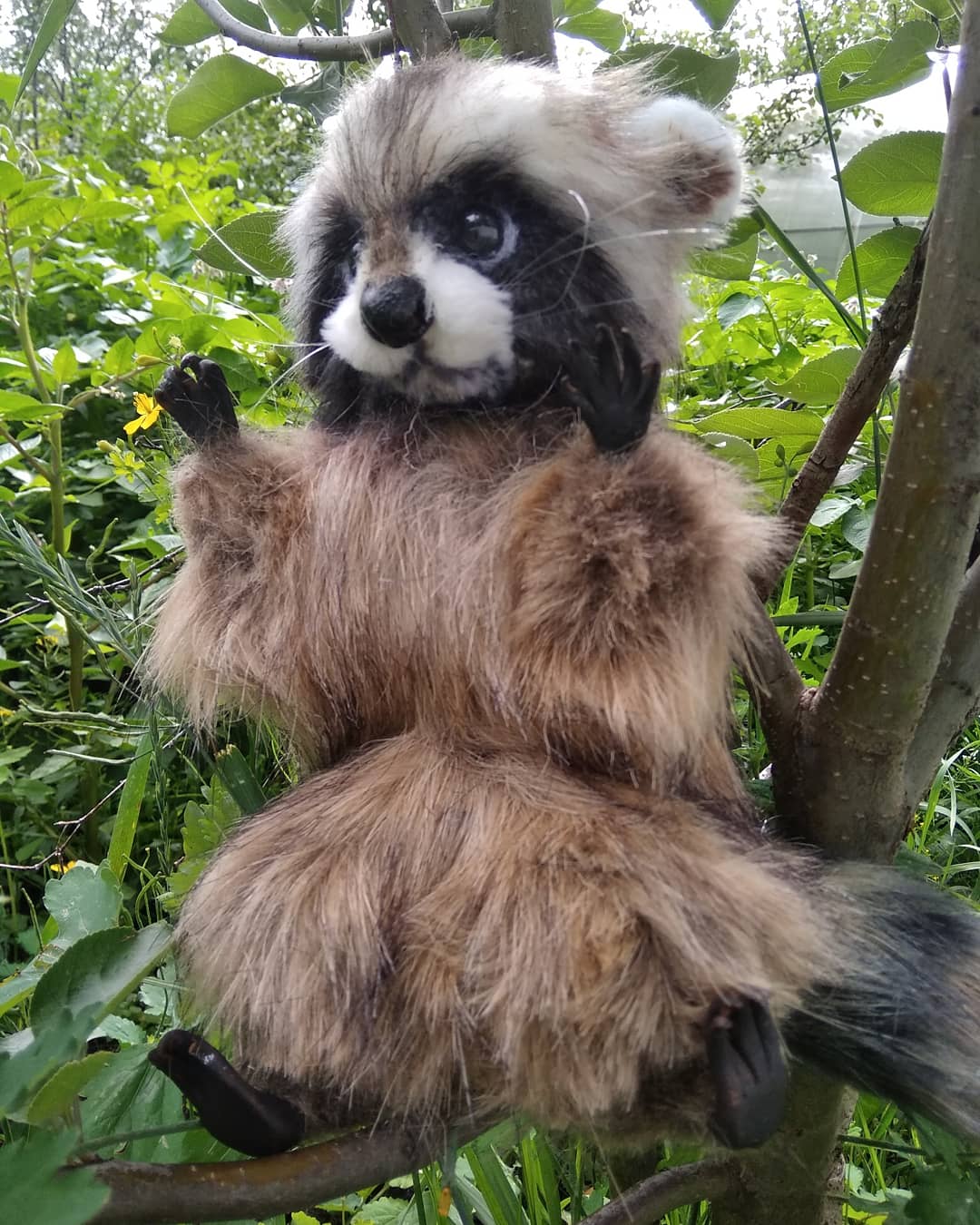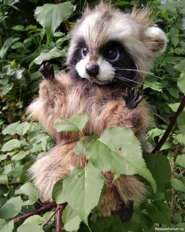 Добрый день, дорогие форумчанки. Сегодня я к вам в гости со своим енотиком. Полностью ручная работа от кончика хвоста до ушек, лапки и носик из полимерной глины, глазки стеклянные, белки вокруг зрачков сваляны из шерсти, на подвижном скелете
