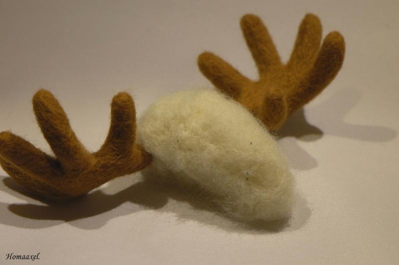 Рога обматываем шерстью дважды, чтобы шерстяная основа была потолще. Так потом будет удобнее проходить по рогам иглой.