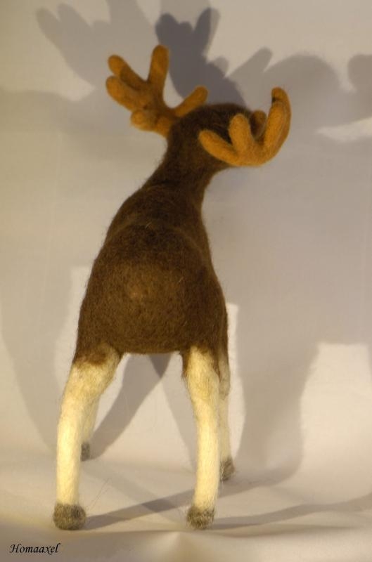 У всякого животного шерсть имеет оттенок. Лось тоже не равномерно темный, у него есть красивые переходы в рыже-коричневый цвет. Буквально по шерстинкам приваливаем светло-коричневый кардочес. Носик делаем из нескольких шерстинок серого и рыжего цвета.
