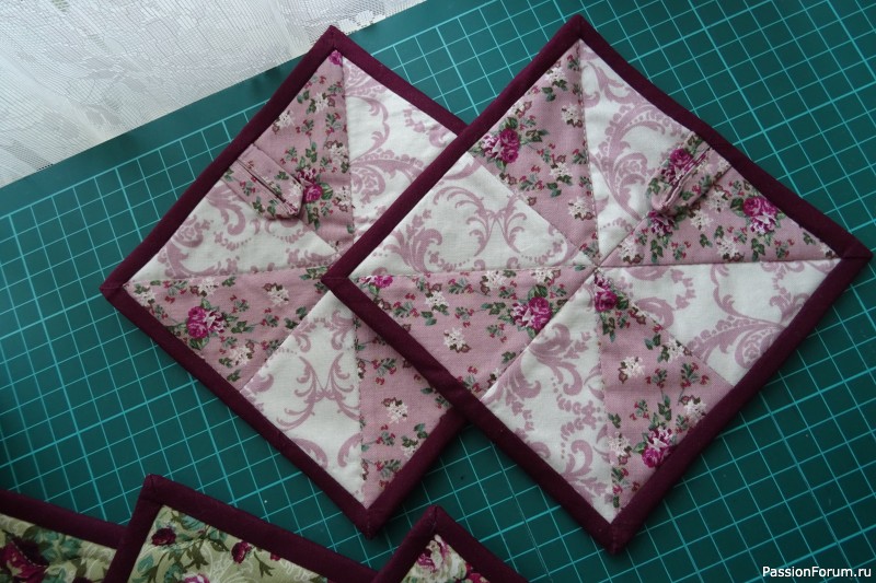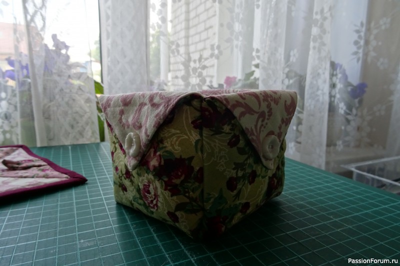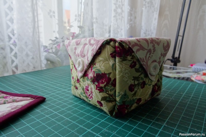 Мне все понравилось! И расцветка и исполнение! Все аккуратно! Коробочки такие мне тоже очень нравится. Я парочку таких шила. Смотрятся хорошо и универсальные. Я использую такую, когда иду шить в другую комнату — нитки, ножницы и все неоходимое туда складываю. Только мне жалко шить (в денежном плане) прихватки из американского хлопка, я из советских тканей шью.