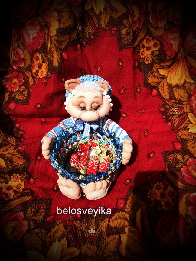 Банальную свинку в платье делать не стала.Смотрела работы других мастериц и увидела идею кукол с корзинками Корзинку сделала сама из фантиков, я уже много лет такие корзинки делаю .