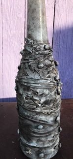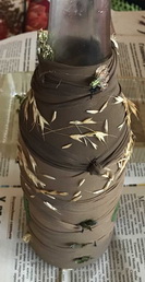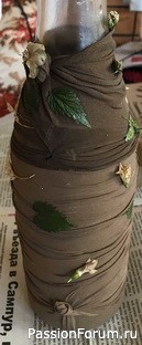 Бутылку очистила от наклеек.Надела капроновую трубу,стала делать узелки, труба уменьшилась в размере по высоте.Добавила трубу другого цвета.Потом взяла клей ПВА, стала промазывать и выкладывать складочки на пропитанном клеем капроне.Тут же приклеила листики, цветочки, колоски.После высыхания покрасила белым акрилом.Потом губкой нанесла серебряную краску.Туту я обнаружила, что фактуры маловато.Листики вообще плохо видны, они плоские.Я решила россыпью добавить зернышки кофе.Потом закрасила губкой все зернышки белым акрилом и добавила белого акрила по ребрышкам складок.После высыхания взяла художественный соус и нанесла тени по всем складкам и вокруг зёрнышек кофе.Покрыла лаком спреем и решила, что декор закончен.