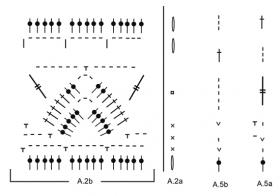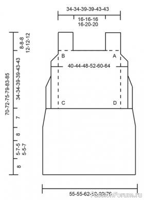 Примечание: этот ряд вяжется для того, чтобы сторона выровнялась по нижнему краю. Закрепить нить ст. б/н в верх возд. арки сбоку, если смотреть с лиц. стороны (в крайнюю арку центра от проймы), вязать 3 возд.п. (1 ст. с/н), вязать 4 ст. с/н в эту же арку, 5 ст. с/н в каждую из след. 4-4-5-5-6-6 арок, 3 ст. с/н в след. арку. Продолжить вязание по 5 ст. с/н в каждую из след. 6-6-7-78-8 арок и 2 ст. с/н в послед. арку = 55-55-6565-75-75 ст. с/н. Сторона закончена, отрезать и закрепить нить. Связать правую боковую сторону симметрично, на выкройке от А и до D. Начать вязание с изн.р стороны, пропустить 15 ст. с/н от угла А. После того, как сторона будет провязана, нить НЕ отрезать. Нижняя часть спинки Измерять длину от этого места. Продолжить вязание рядами по нижнему краю детали. Начать вязание с изн. стороны и 2-го ряда: A.4a, 3-4-4-5-6-7 повторения по схеме A.4b по правому краю спинки, далее еще продолжить вязание по схеме A.4b на след. 75-75-85-8595-95 ст. с/н (между С и D), 3-4-4-5-6-7 повторения по схеме A.4b по левому краю и закончить А.4с в послед. ст. с/н = 21-23-25-2731-33 арок. Повторить 3 и 4 ряды схемы 3 раза, в это же самое время прибавить по 1 п. арке в каждом 4-ом ряду схемы = 27-29-31-3337-39 арок = 7 см. В след. лиц.р.: по 4 ст. с/н в каждую арку, в это же самое время равномерно прибавить 14-6-13-5-4-11 ст. с/н = 122-122-137-137-152167 ст. с/н. Начать вязание со 2-го ряда схемы: A.5a, вязать A.2b, A.5b. В послед. ряду равномерно прибавить 15-25-20-30-35-30 ст. с/н = 137-147-157-167-187-197 ст. с/н = 15 см. Начать вязание со 2-го ряда схемы: A.4a, вязать по схеме A.4b до послед. ст. с/н ряда, А.4с. Повторять 3 и 4 ряды схемы пока всего