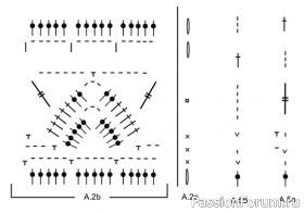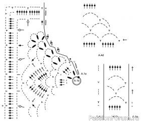 Примечание: в начале каждого ряда со ст. с/н вязать 3 возд.п. Прибавления : выполнять прибавления в каждой стороны с помощью арок (6 возд.п. и 1 ст. б/н) в первую и послед. арки ряда. Спинка Начать вязание с квадратного мотива по схеме A.1b, на схеме A.1a показано начало и конец каждого круга = 21х21 см. Отрезать нить. Начать вязание от ст. б/н, отмеченного звездочкой в послед. кругу на схеме A.1b и вязать, начиная с 3-го круга схемы: A.2a, A.2b на след. 3-х возд.п, *A.2c в угол, A.2b в след. 9 арок (3 повторения), повторить от * еще 2 раза, А.2с в угол и закончить A.2b в оставш. 6 арок (2 повторения). После того, как все круги по схемам будут провязаны, размеры мотива = 34х34 см. Далее продолжить вязание для размеров L, XL, XXL и XXXL: вязать 2 возд.п., начать вязание со 2-го ряда и вязать по схеме А.3а, A.3b по кругу, в углы вязать по схеме А.3с = 39х39 см. Далее вязать только для размера XXL и XXXL: повторить послед. 2 круга по схеме А.3 еще раз = 43х43 см. Отрезать нить. Правое плечо Начать вязание со 2-го ряда схемы и вязать плечо рядами: А.4а в угол А, A.4b на след. 2020-25-25-25-25 ст. с/н (4-4-5-5-5-5 повторений), А.4с в расстояние между 2-мя ст. с/н. Повернуть вязание и продолжить вязание в обратном направлении по схемам А.4а-А.4с. Потом повторить ряды 2-5 1-1-1-2-2-2 р. = 8-88-12-12-12 см высота плеча. Отрезать нить. Левой плечо Пропустить 35-35-35-35-45-45 ст. с/н для выреза горловины и вязать на 20-20-25-25-2525 ст. с/н симметрично правому плечу. Левая боковая часть (между В и С на выкройке). Пропустить 15 ст. с/н от арки в углу В. Начать со 2-го ряда по схеме A.4d на след. 10 ст. с/н, вязать A.4b на след. 50-50-60-60-70-70 ст. с/н, закончить А.4с в угол С. Повернуть вязание и вязать по схемам пока 4-ый ряд будет провязан. Сейчас убавлена 1 арка в A.4d = 11-11-13-13-15-15 арок. Вязать 3 и 4 ряды по схемам A.4a, A.4b и A.4c еще 0-1-1-23-4 р. = 11-11-13-13-15-15 арок с левой стороны. Начиная с 3-го ряда в след. изн.р.: A.4c, A.4b 5-5-6-6-7-7 раз, 3 возд.п. и 1 ст. б/н в след. арку. Отрезать нить.