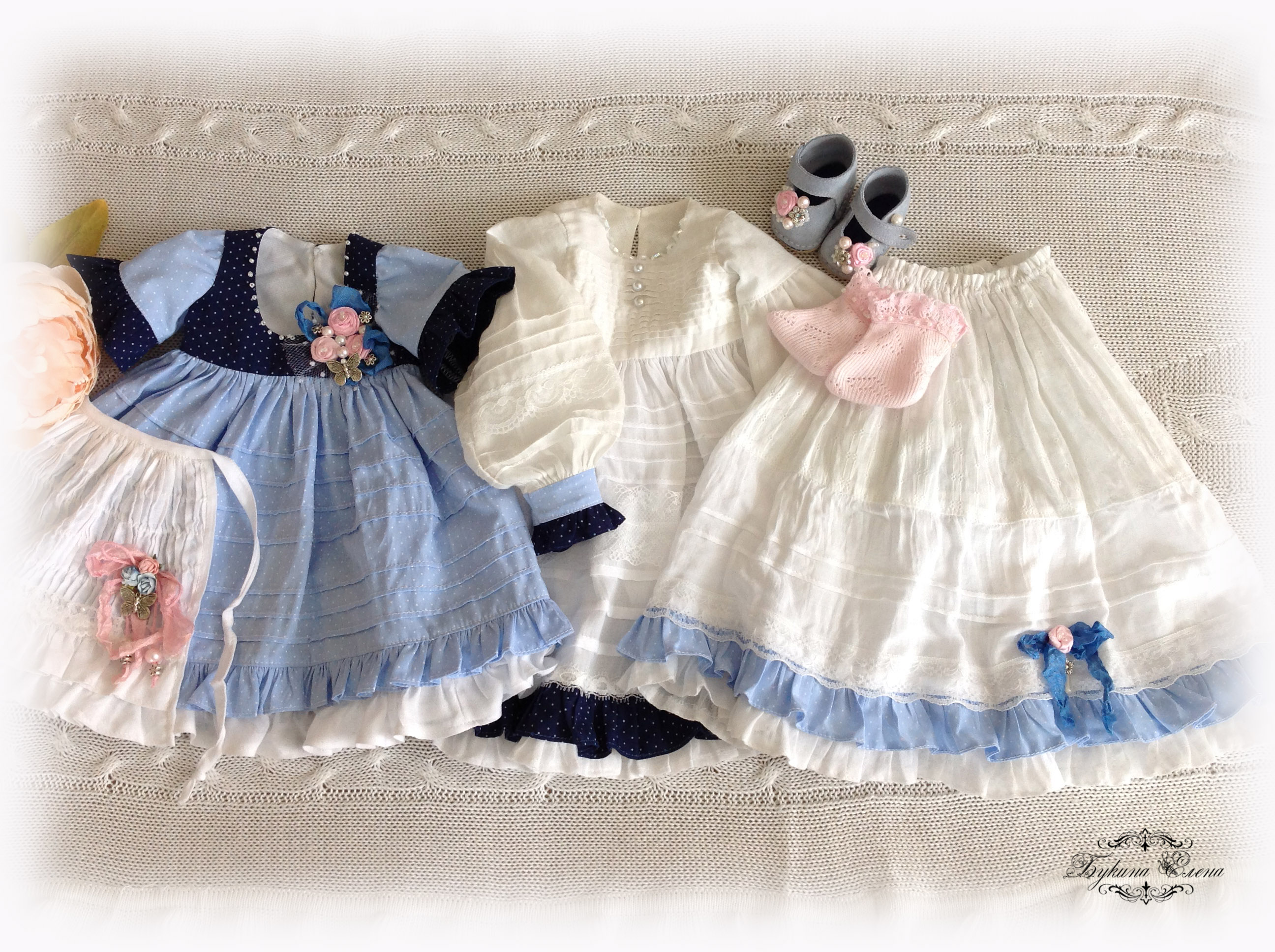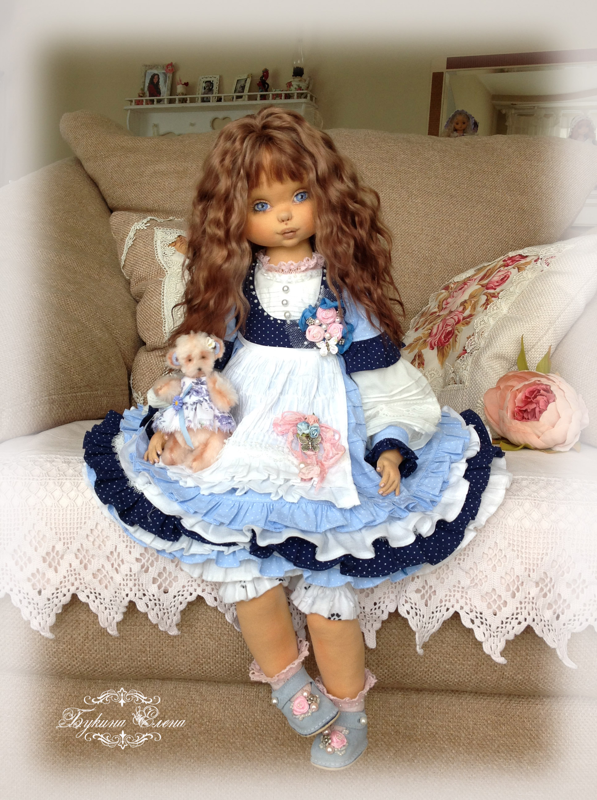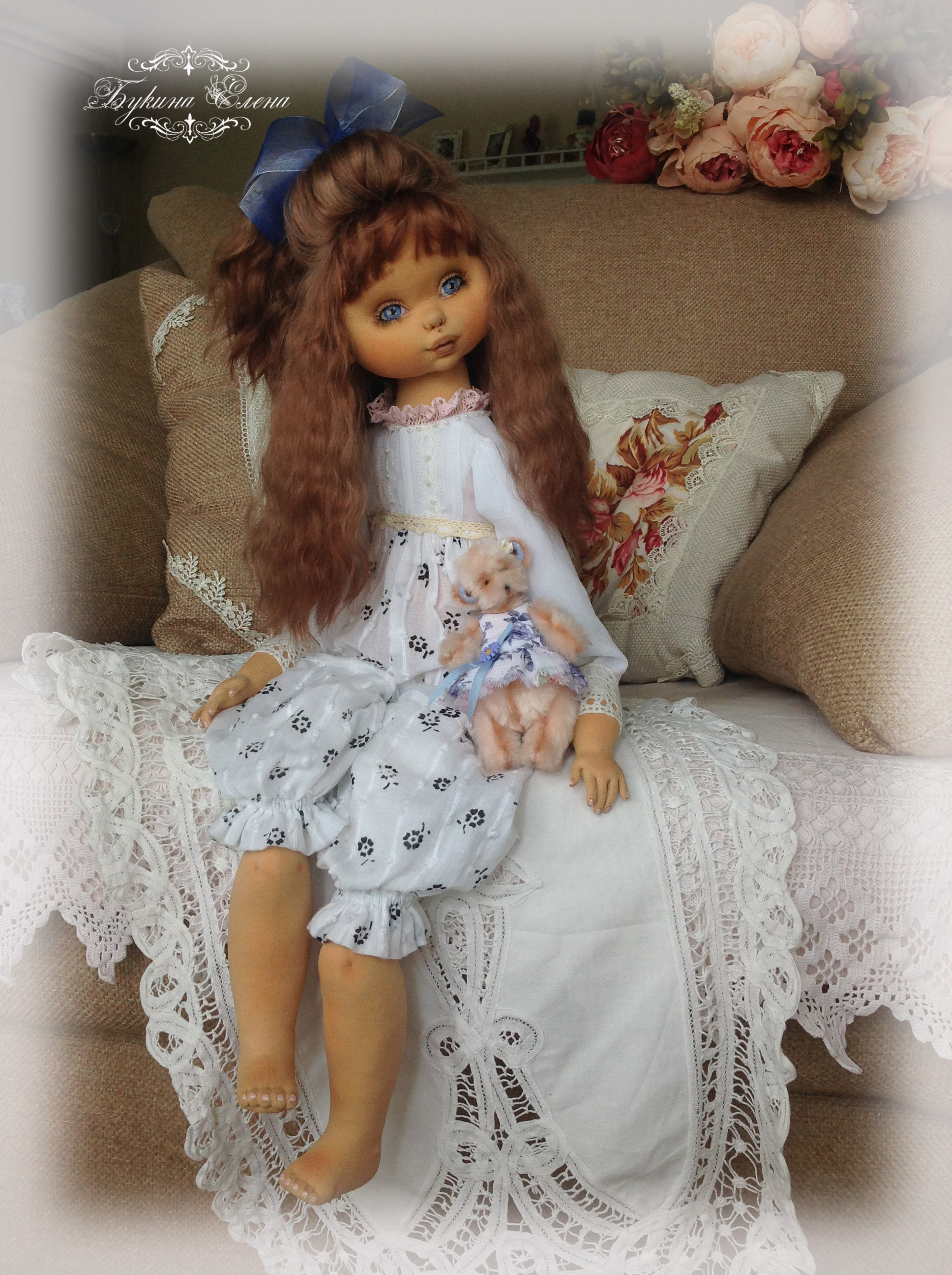Василинка, коллекционная текстильная кукла. Куколка в этот раз ростиком больше, чем предыдущие мои куколки, около 55 см. Малышка сшита из хлопка, обтянута трикотажем. Личико объёмное. Девчушка вся подвижная. Головушка крутится и наклоняется. Ручки и ножки крепятся, как у будуарных кукол или куклы-болтушки. Василина стоять не хочет, зато она умеет красиво сидеть и мило складывать ручки. Пальчики на ручках гнутся, есть маникюр. Волосы — натуральная козочка, очень мягкие, можно аккуратно расчесывать, закручивать, менять прическу. Вся одежда съёмная, кроме комбинезона. Одежка сшита из хлопка, батиста,плательной ткани, украшена кружевом, бисером, шебби лентами. Ботиночки сшиты из натуральной замши. У Василинки есть маленький мишка , ростик у него 12 см. Ищет любящий дом.