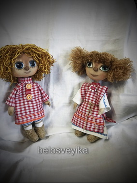 11) Теперь осталось отшить одежду для девочки.Сделала ей платье и решила объединить образы кукол одной тканью Сверху из клетчатой ткани сделала накидку. Волосы сделала из распушенной пряжи, долго игралась с волосами, пока мне брат не подсказал, что надо сделать ей 2 хвостика, как у девочки.