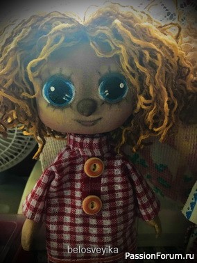 14).Ещё заказчица попросила красную ткань в белый горошек на рубашку.Но так как у меня пока нет возможности ее купить, куплю по возвращении из отпуска и сошью рубашку А чтоб он голенький не стоял, одела на него нижнее белье. Волосы из пряжи, глаза зелёные, круглые, нос нарисованный.Заказчица довольна и я то же.