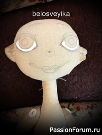 8) Расписываю второе лицо по другому, с круглыми голубыми глазами, Отсылаю ей, она довольна Делаю волосы другие, она довольна.Спрашиваю согласна ли она низ от первой куклы пришить ко второй?Она соглашается..Переделываю.
