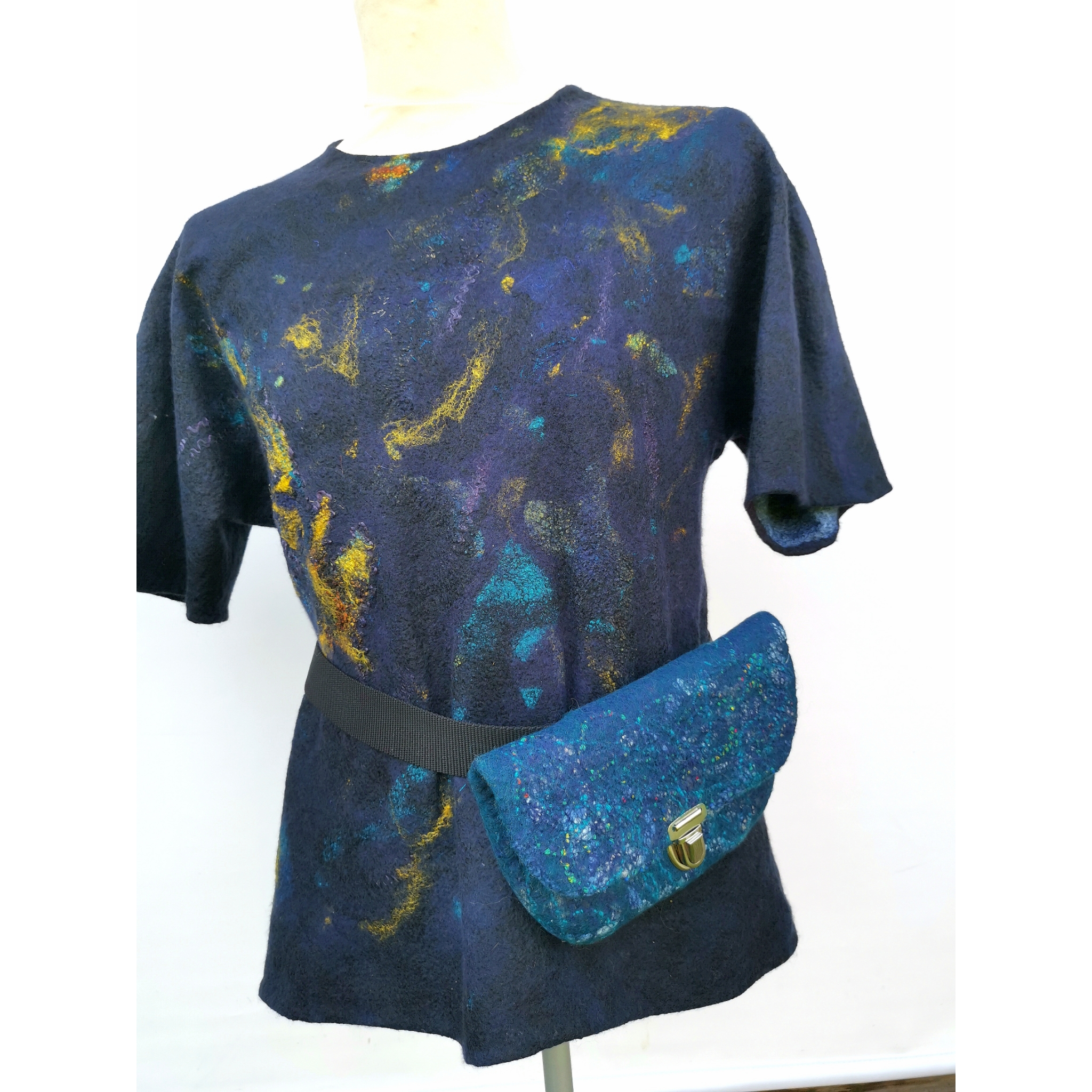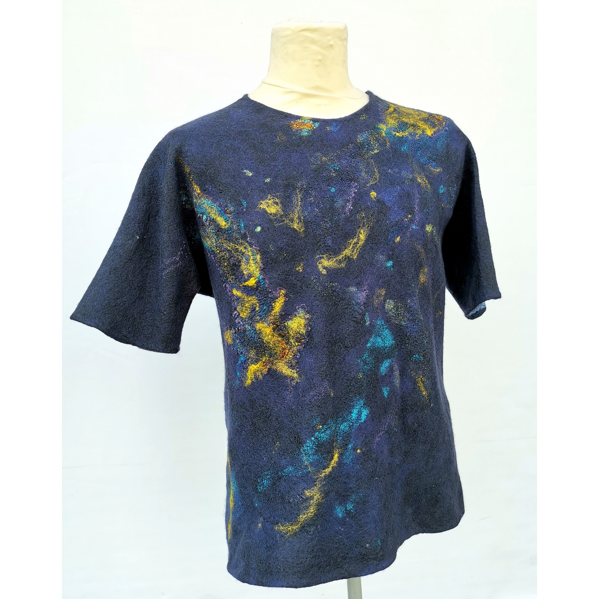 Девочки, снова здрасте! Захотелось показать вам свою работу для мужчины. Сваляла очень тонкую, пластичную футболочку (если честно, то не знаю как её назвать). В голове крутилась картинка звёздного неба, звездопада. Сваляна на шёлке, меринос итальянский 18 микрон и вискоза.