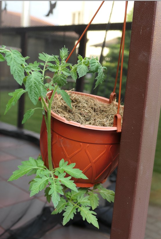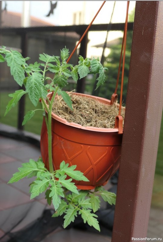 В середине мая, когда уже моя рассада чуть подросла и можно ее было пересадить, достала я 2 -ух литровый вазон от цветов, сделала чуть пошире дыру в донышке, прикрыла ее мелкой сеточкой и... сунула туда вверх ногами своего "подопытного кролика". Добавила земли, напоила водой и повесила на ветку сливы.