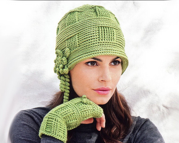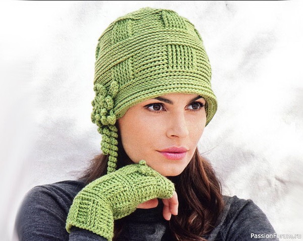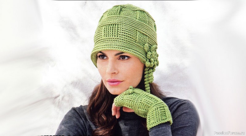 Вам потребуется: 150 г для шляпы и 100 г для митенок светло-зеленой пряжи Qual Merino-Cotton (52% мериносовой шерсти, 48% египетского хлопка, 120 м/50 г), крючок № 4.