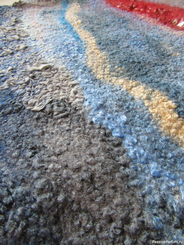 Принцип тот же,что и раньше-3 слоя,но в этот раз на изнаночной стороне- вискоза,затем шерсть- тут остатки разной шерсти,разной микронности и цвета,и разные лоскуты- марля,шелк,вискоза,уложила все,что в голову пришло.