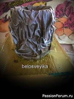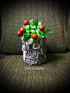 Можно сделать и более правдоподобный вариант пенька, тогда до обклеивания тканью надо с помощью фольгированной бумаги сформировать корни внизу по бокам и приклеить корни клеевым пистолетом.Можно приклеить к дну, но так, чтоб торчали, искусственную зелень, травку или цветочки, можно приклеить по низу шишки или ягоды.Далее украшайте, как вы захотите.