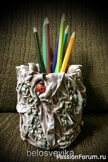 Если вы будете использовать пенёк как самостоятельный аксессуар, то сверху можно вклеить кружок, на котором нарисовать многолетние кольца, как на срезе дерева.Его можно использовать как подставку под свечу, под ручки и кисти. А можно посадить на него куколку, например домового или лесовика.Ещё использовать как ступу для куклы " бабы Яги"