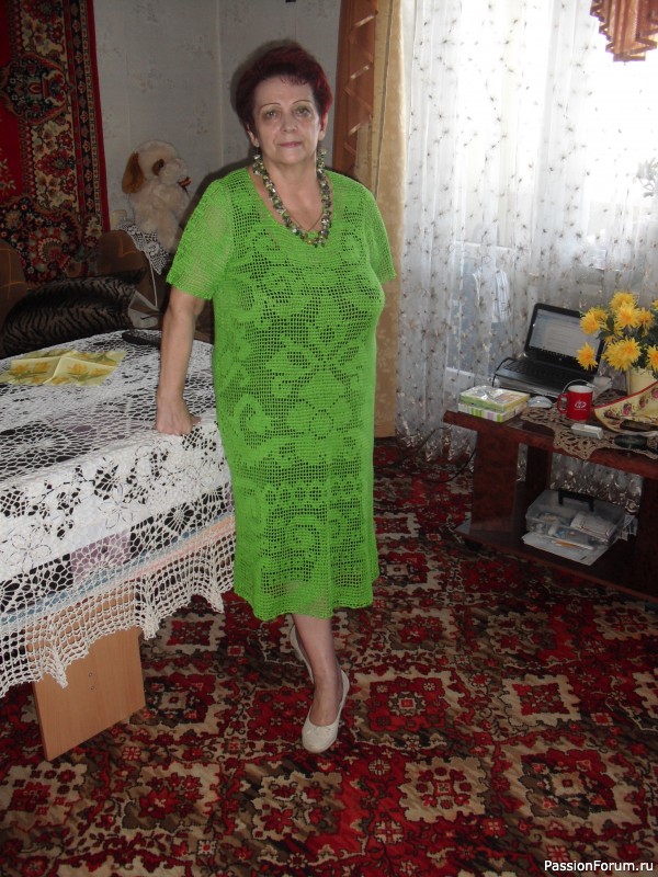 Спасибо. Мне это платье очень нравится, оно похоже на гипюр… Когда одеваю, некоторые думают, что полотно выполнено на машинке… А я разочароваю, говорю, что не придумали машинок ещё. Ручное вязание. Это те говорят, кто не вяжут.