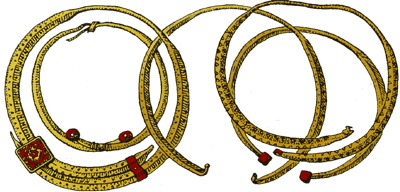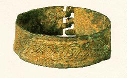 Гривны нередко находят в женских погребениях древних славян. Поэтому археологи с полным правом настаивают, что это было «типично женское» украшение, наподобие бус и височных колец. Древние славянские мастера делали гривны из меди, бронзы, биллона (меди с серебром) и из мягких оловянно-свинцовых сплавов, нередко покрывая их серебром и позолотой. Драгоценные гривны делались из серебра. Древние славяне носили разные виды гривен, отличавшиеся способом изготовления и соединения концов. И конечно, каждое племя предпочитало свой, особенный вид. Дротовые гривны делали из «дрота» - толстого металлического прутка, обычного круглого или треугольного в разрезе. Кузнецы перекручивали его клещами, раскалив на огне. Чем горячее был металл, тем мельче получалась «нарезка». Чуть позже появились гривны из ромбического, шестиугольного и трапециевидного дрота. Их не скручивали, предпочитая выбивать сверху узор в виде кружков, треугольников, точек. Эти гривны находят в курганах X – XI веков. Похожие, только соединенные не замочком, а просто далеко заходящими друг за друга концами, изготавливали сами славяне. Разомкнутые концы таких гривен находились спереди. Они красиво расширяются, зато тыльная сторона, прилегающая к шее, круглая, чтобы удобнее было носить. Их обычный орнамент состоял из треугольников с выпуклостями внутри. Их археологи называют «волчий зуб». Такие гривны, сделанные из биллона, бронзы и низкопробного серебра, носили в X – XI веках в племени радимичей. В XI – XII веках радимичи стали соединять концы гривен красивыми квадратными бляхами, штампованными или литыми. Некоторые бляхи, рассеянные на значительной территории, отлиты явно в одной мастерской, даже в одной формочке. Это говорит о развитой торговле и о том, древнерусские мастера-ювелиры работали не только на заказ, но и на рынок. Некоторые шейные обручи, сделанные из толстой или бронзовой проволоки, носили «просто так», без дополнительных украшений. Но если железная или цветная проволочка была достаточно тонкой, на нее нанизывали бусы, круглые бляхи, иноземные монеты, бубенчики. Самыми многочисленными были гривны витые. Славянские умельцы свивали их разными способами: «простым жгутом» - из двух-трех медных или бронзовых проволочек; «сложным жгутом». Иногда простой или тонкий жгут обвивали сверху тонкой крученой проволочкой. Височные кольца Украшение головного убора, укреплявшимся обычно возле висков, археологи назвали «височными кольцами». Славянские женские подв Девочки-подростки, еще не вошедшие в возраст невест, совсем не носили височных колец или, в крайнем случае, носили самые простенькие, согнутые из проволоки. Девушки-невесты и молодые замужние женщины, понятно, нуждались в усиленной защите от злых сил, ведь они должны были беречь не только себя, но и будущих младенцев – надежду народа. Их височные кольца, поэтому, особенно нарядны и многочисленны. А пожилые женщины, преставшие рожать детей, постепенно отказывались от богато украшенных височных колец, передавая их своим дочерям. Совсем иначе выглядели височные кольца с бусами, нанизанными на проволочную основу. Иногда металлические бусины делались гладкими и разделялись проволочными спиральками — такие кольца любили не только славянки, но и женщины финноугорских народов. В XI—XII веках это было излюбленное украш