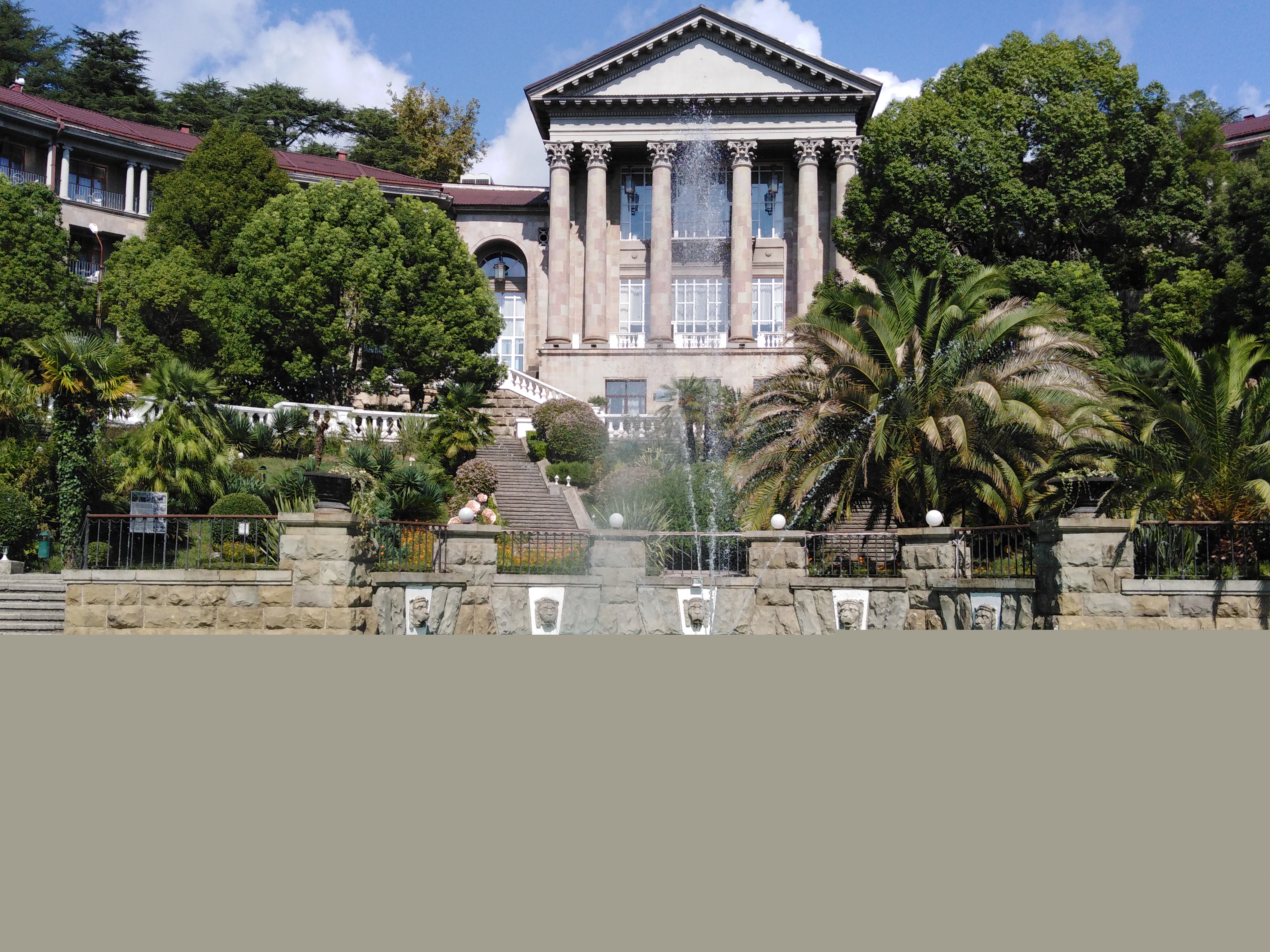 Здравница строилась в стиле классического барокко, и эти черты сохранены по сей день. Универсальный архитектурный ансамбль появился благодаря установке правительства в 1956 году обеспечить трудящимся "отдых во дворце". Великолепный парк, который меня поразил после городского пейзажа. Санаторий располагает собственной парковой зоной с растениями, свойственными субтропикам, а также вечнозелеными и хвойными деревьями. Каждое растение обозначено стикером, некоторые обозначения попали на фото. В зависимости от расположения номера, с балконов открывается прекрасный вид на прекрасный парк. На главной алеи водоем с фонтаном, где можно загорать или вечером медитировать под шум падающей воды. На территории много лежаков, на которых можно позагорать или просто полежать в тени деревьев, ведь каждое из них это натуральный ингаляторий, вдыхая запах эвкалипта, лавра или хвойных деревьев.