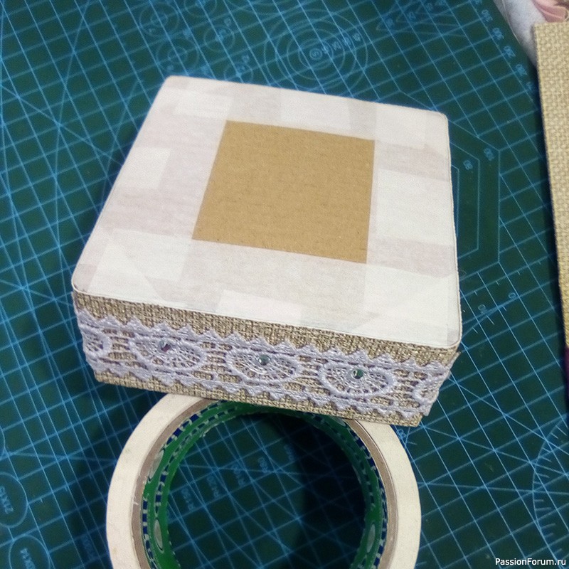 Конечно, не всё шло гладко. Где-то перестаралась, и клей на лицевую сторону ткани проступил, где-то, пока внутри оформляла, прилепилась крышкой к утюгу, сплавила... Поэтому, может быть, кое-где декор покажется лишним. Но, так как времени у меня было весьма ограниченное количество, переделывать было невозможно, пришлось маскировать. Как говорится:"От этой картины большая польза, она дырку на стене закрывает!"