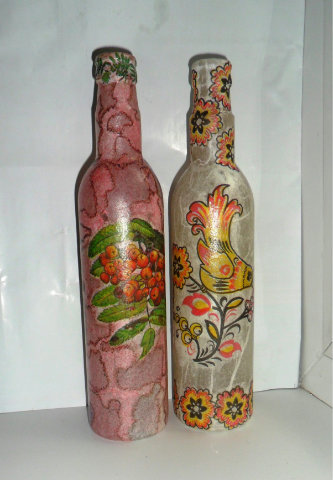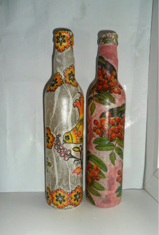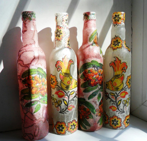 А бутылочки в реале не такие яркие, это обработка в программе делает фото и предметы такими яркими. Салфетки клеила на голые бутылочки, без грунтовки и такая техника называется «Декупач» В такой же технике делают поверхности под камень (бутылочки, шкатулки...) Экономный способ — все неликвиды в дело уйдут.
