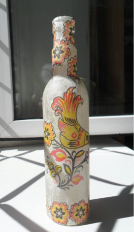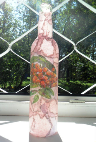 А начало вот с такой бутылочки. Имитация рисовой бумаги. Наклеила второй слой салфеточки на клей ПВА