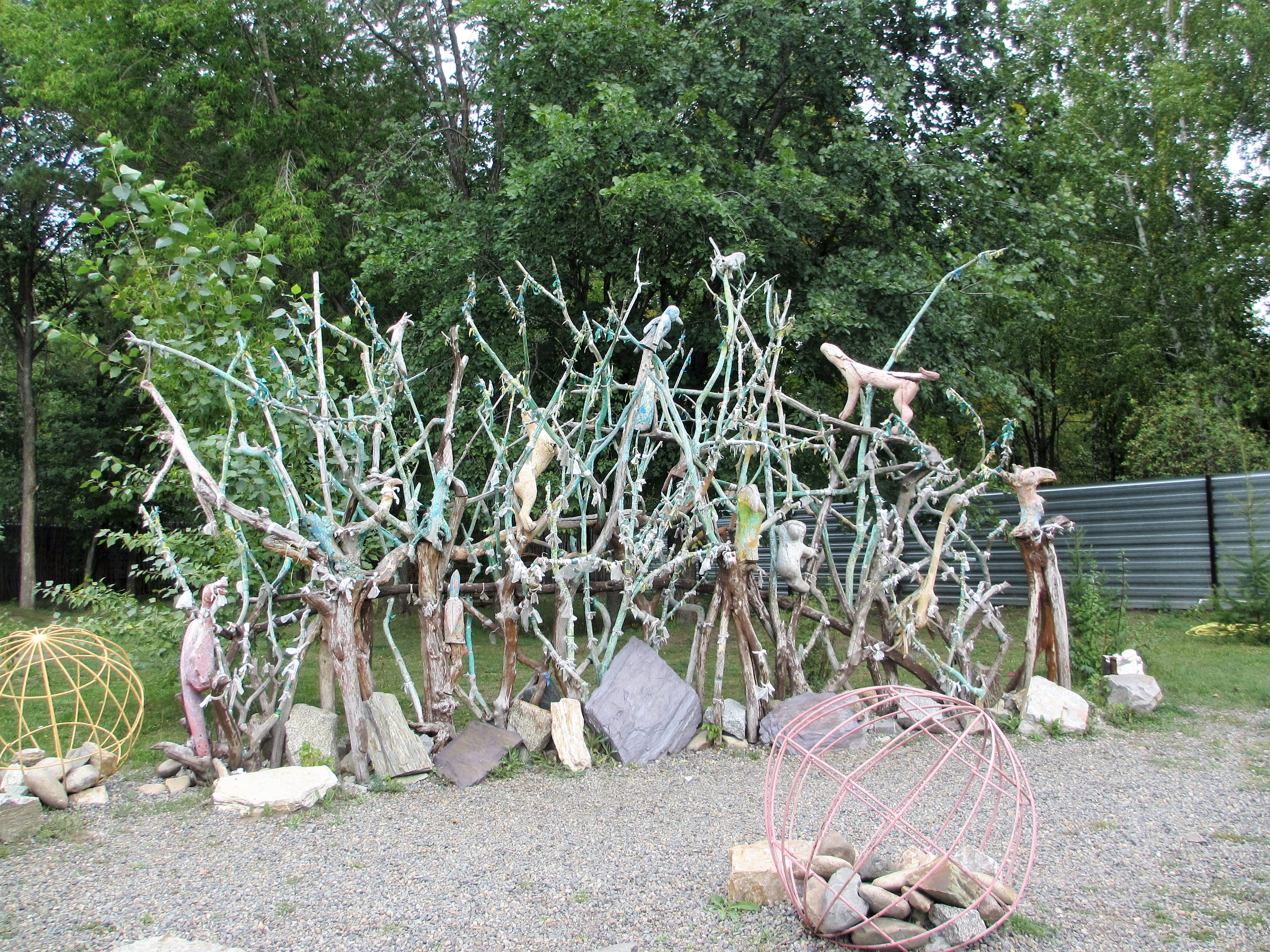 Экологическая инсталляция у кафе "Сохраним природу планеты!" Фигурки различных животных карабкаются по умирающему лесу.