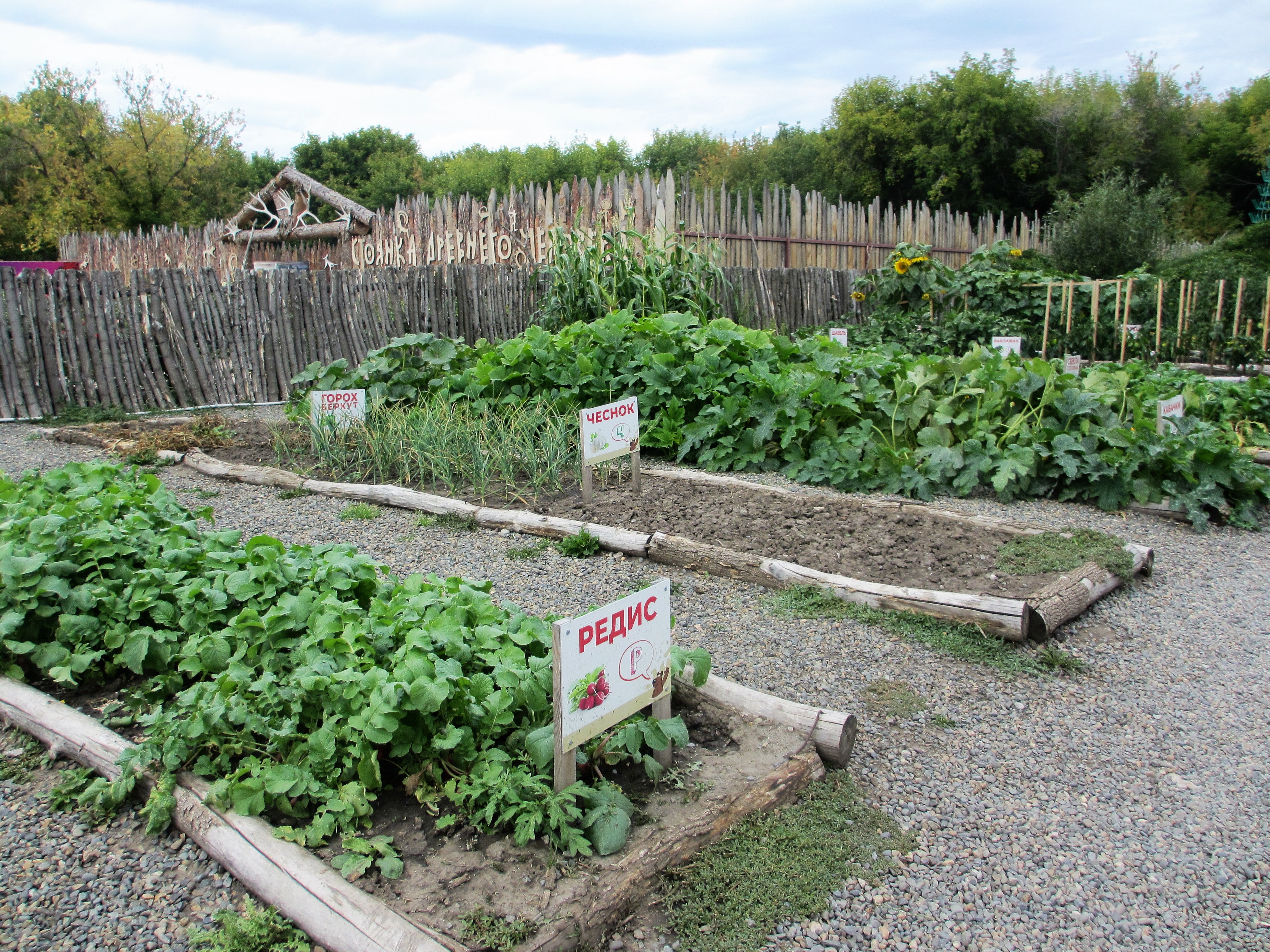 У каждой грядки табличка с названием культуры; есть инструменты, требующиеся для ухода, пугало; стоят импровизированный колодец и русская печь.