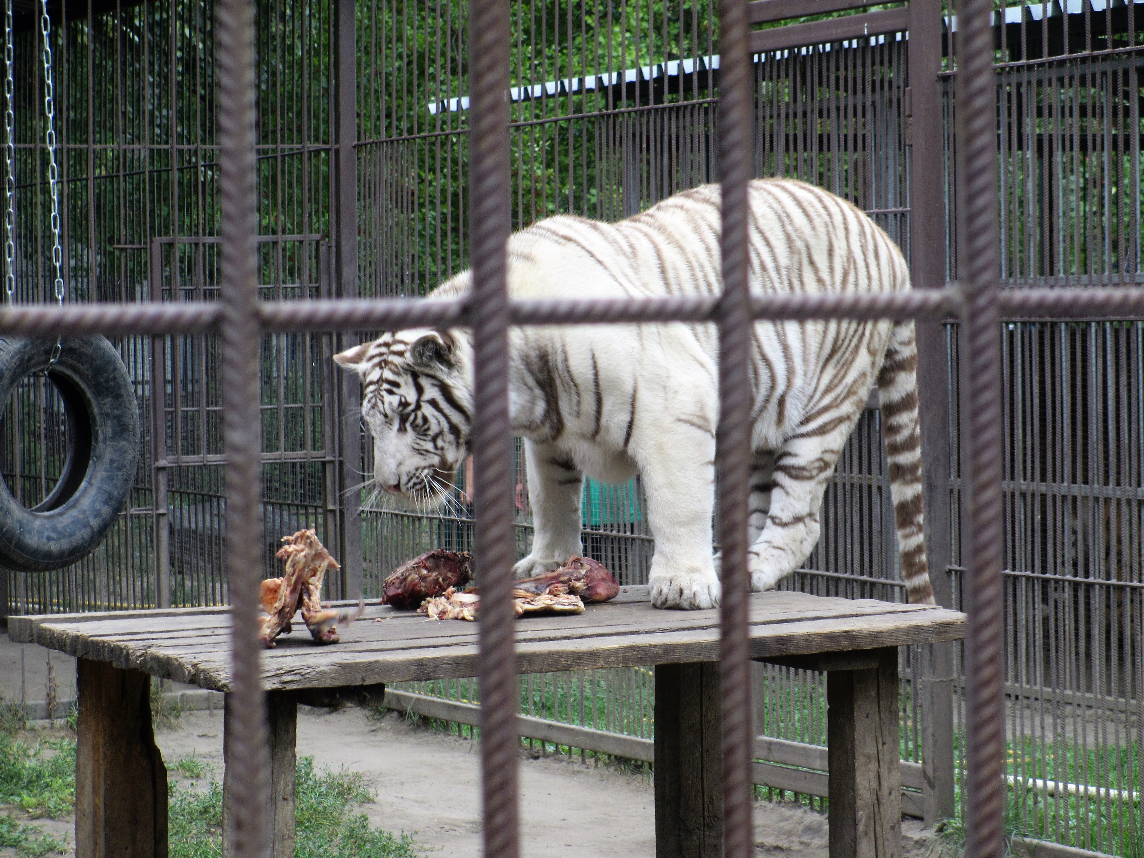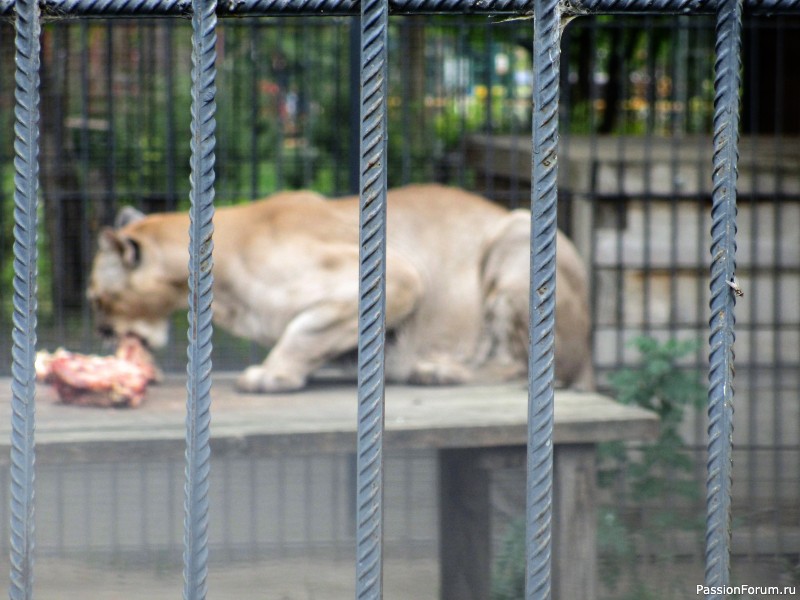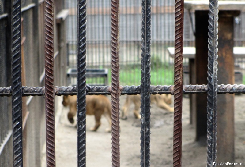 Долго наблюдаем за хищниками. Жаль, что льва и тигрицу так и держат в глубине (их еле видно), а ведь виноваты сами люди, которых они покалечили! На многих клетках таблички "Просим соблюдать тишину! Нас посетил аист!" Детёнышей полный зоопарк!