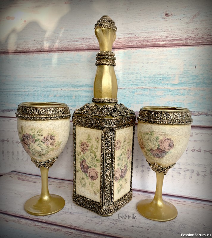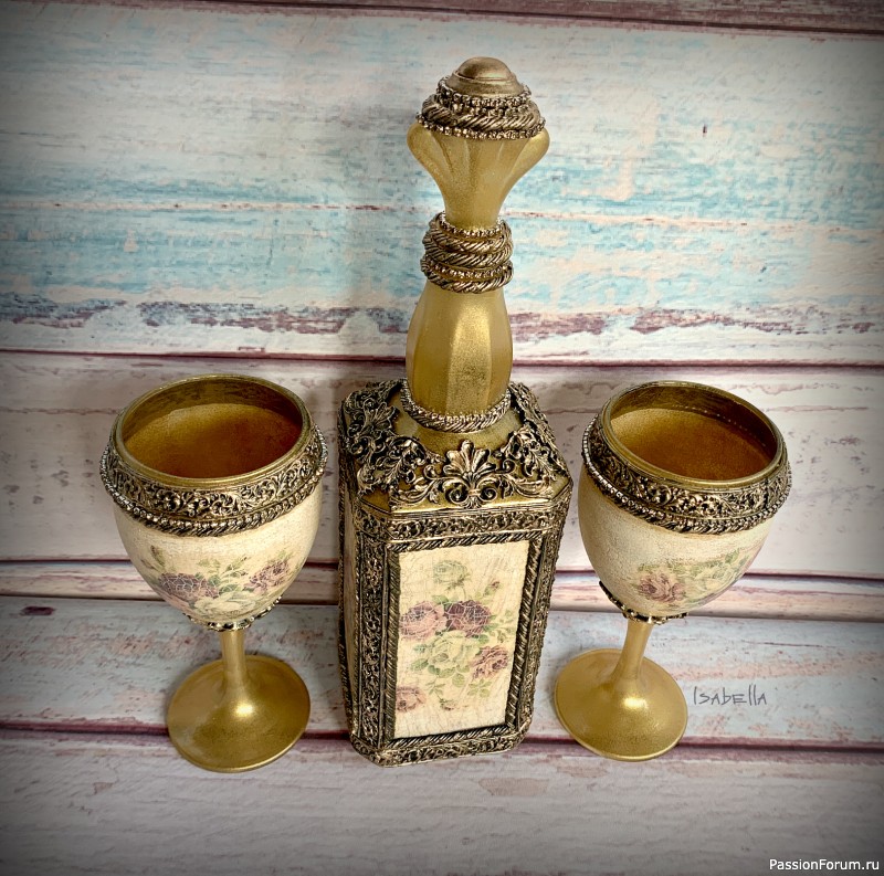 Бэлла, очень красивый набор. Все конечно подобрано с большим вкусом. Если подходит интерьер, будет интересно смотреться. Мне такие вещи очень нравятся, но со стороны. Ни делать такие не получается, ни дома поставить не к месту. На горлышке бутылки это лаковая поталь или просто краска?