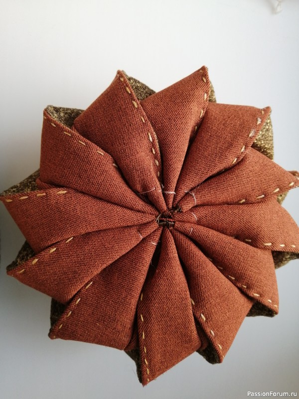 И с противоположной стороны закладываем складки в другую сторону. Как вы успели заметить, на ребрах складок, решила проложить льняной ниточкой декоративную примитивную строчку, как то так увидела