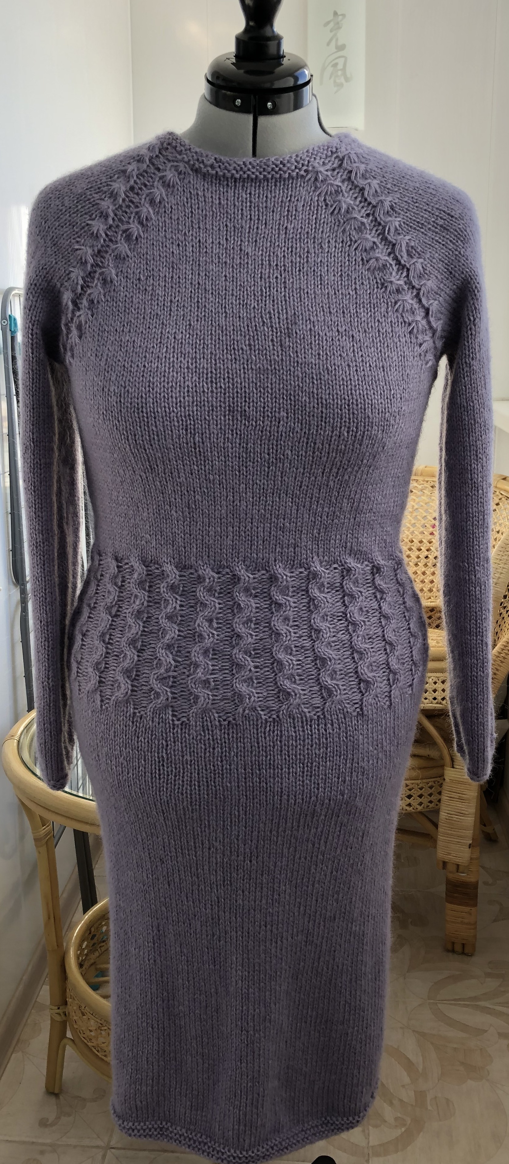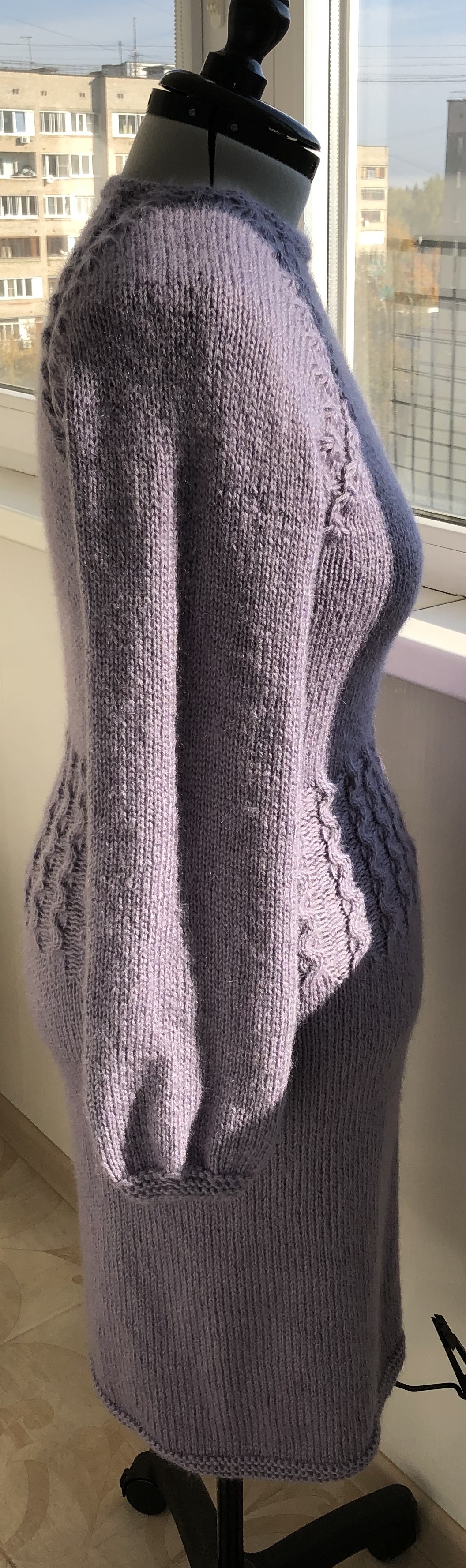 Платье-футляр лавандового цвета, размер 44, связано из пряжи Alise angora gold , 550 м/ 100 г в два сложения, спицы №№ 4,5; 5,0. Расход 470 г.
