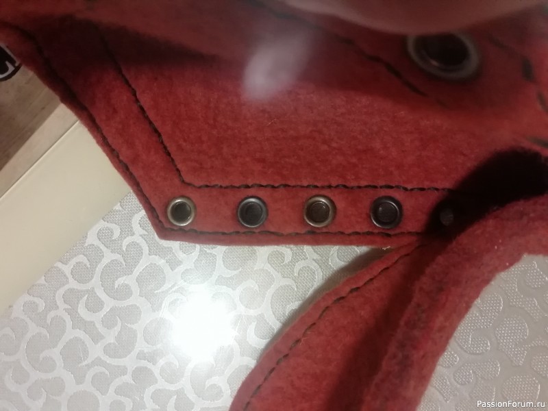 Всем добрый день! Отбываю вынужденные каникулы с детьми в деревне, а чтобы не скучать по вечерам, доделываю брошенную летом обувку. Заготовку сваляла еще в августе, но, как-то, руки не доходили довести до ума. Планировался подарок для стригущей мою семью знакомой. Ботинки должны были быть теплыми, поэтому валяла толстый войлок. Отделка кожей. Впервые применила двусторонний скотч для приклеивания деталей, очень понравилось. Внутри ботинка, в носке и пятке, заваляна льняная ветошь, которая создает отличный каркас. Я раньше пробовала и проклеивать, когда валяла ступню с блокиратором, и внутреннее укрепление делала из гранитоля, но, почему-то, этот способ для меня оказался самым легким и практичным. А вот когда дошло дело для установки блочек, тут я поняла что влипла. Ножка моих блочек оказалась короткой для моего толстого войлока, а я еще и кожу пришила)))). Кружила я вокруг своих ботинок неделю)))))), пока не приехала в деревню. Придумывали с соседом как быть. Нашли подходящий по диаметру железный пробойник, который сужался на конус и им, при помощи молотка, расширили диаметр блочки.