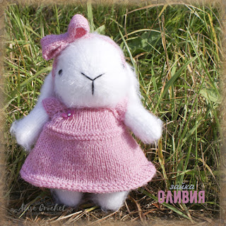 Материалы: пряжа Nako Paris (тело) Пехорский текстиль Деревенская (платье), спицы № 2,5 (тело) 3,25 (платье), наполнитель, глазки пришивные 9 мм, 2 пуговицы, украшение цветок