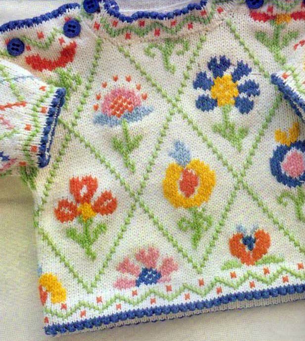 Только на переде и рукавах. На бумаге в клетку (необходима для вязания жаккарда или вышивки) нарисовать ромбы, начав с центра вязания (= всего 78 п.), каждая петля равна 1 вышитой петле. У ромбов по всем углам 1 общая петля с соседними ромбами. Этот рисунок очень облегчит его перенос на вязаную деталь при помощи вышивки (см. модель). Вышив все ромбы сложенной вдвое зеленой нитью, вышить цветочек в центре каждого ромба или другие рисунки по вкусу. После вышивки вновь отутюжить детали с изнанки, просто приставляя утюг и не передвигая его.Сборка
