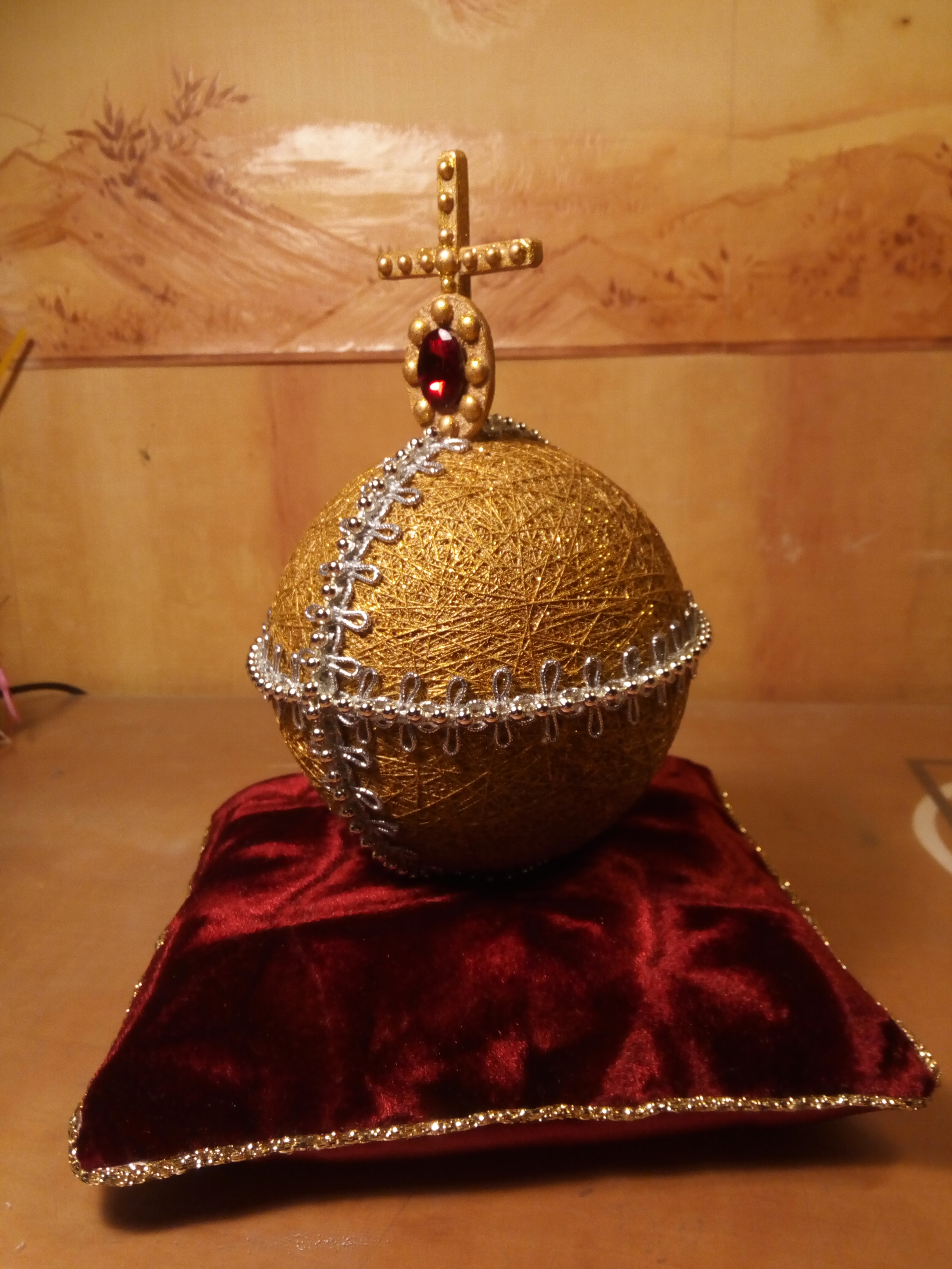 ....заказали мне в качестве "тематической поделки руками ребенка" для школы "Державу".....державой назвать мне это сложно....скажем так: стилизация под "Держава на бархатной подушечке". Естесно, бюджет ограничен....времени тоже в обрез....хорошо хоть не "на завтра"