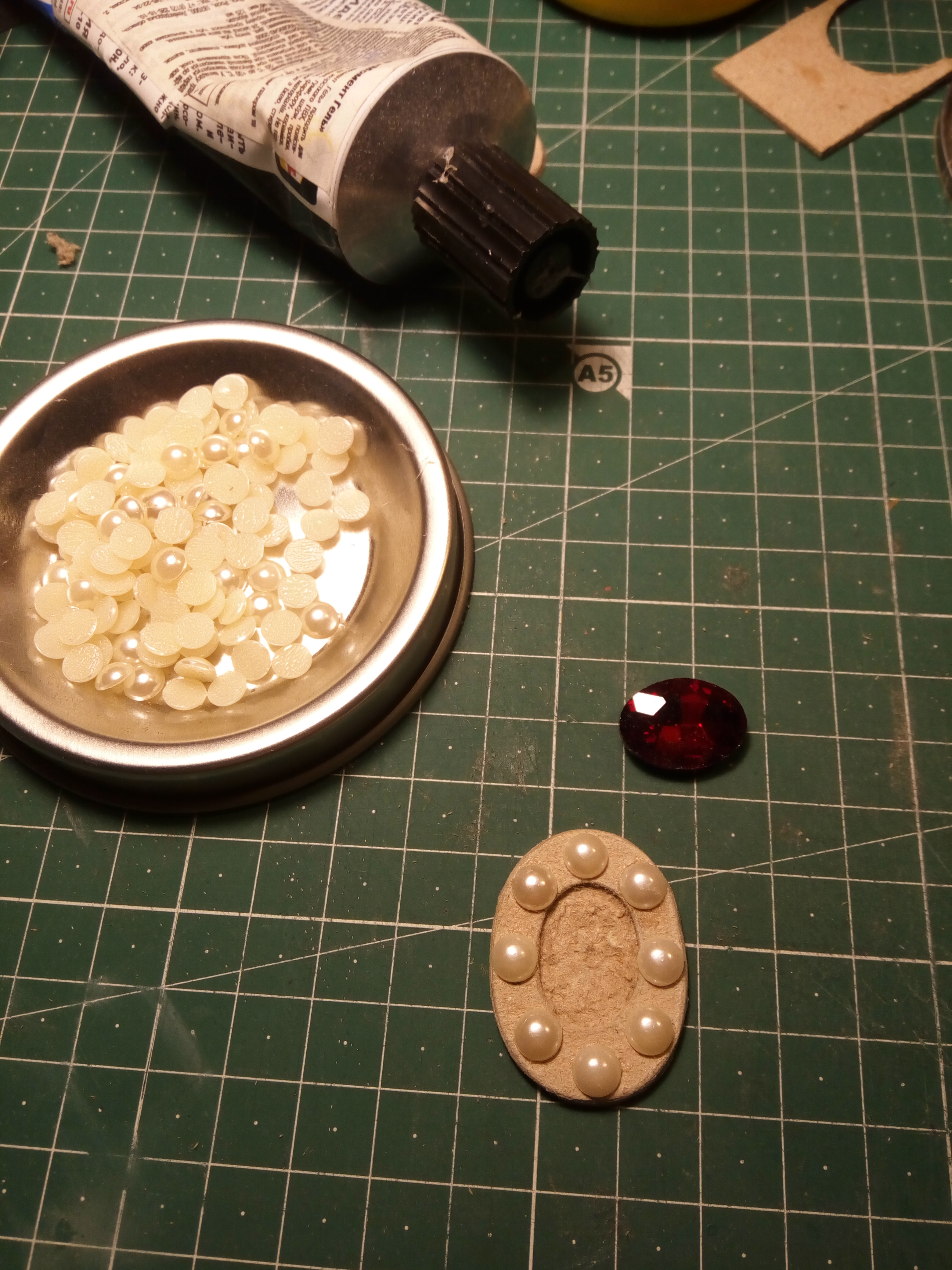 Оправу для "брыльянта" при помощи строительного ПВА приклеила к кресту. Затем все тщательно прокрасила декоративной краской "Золото", покарыла глянцевым лаком из баллончика и отправила сушиться.