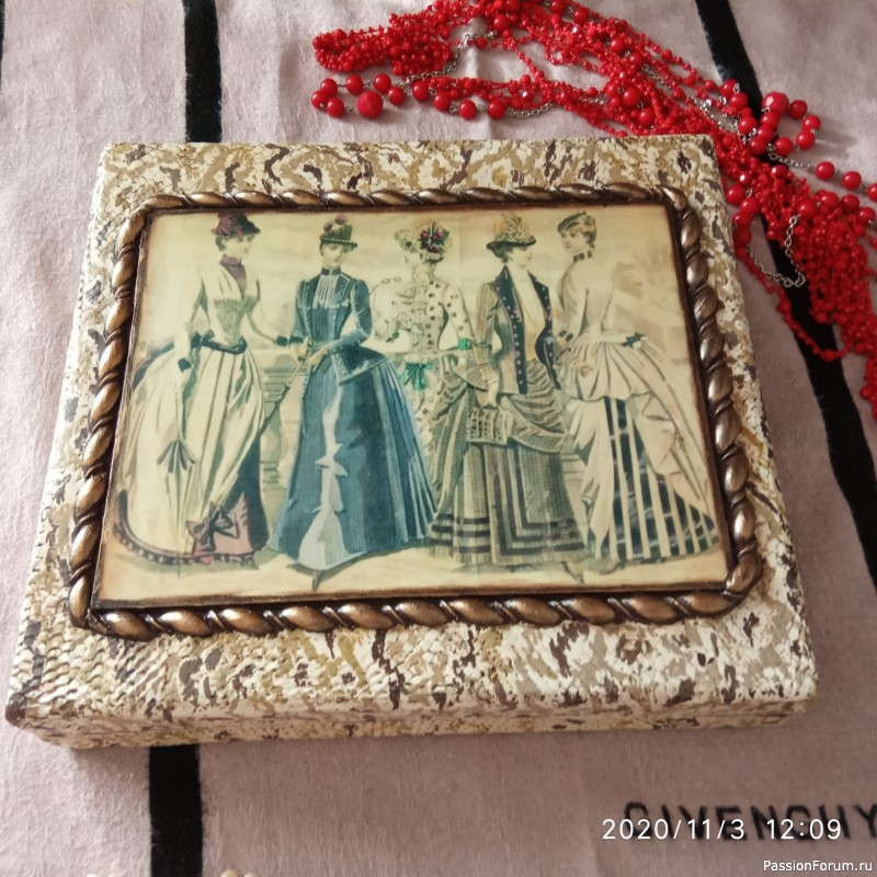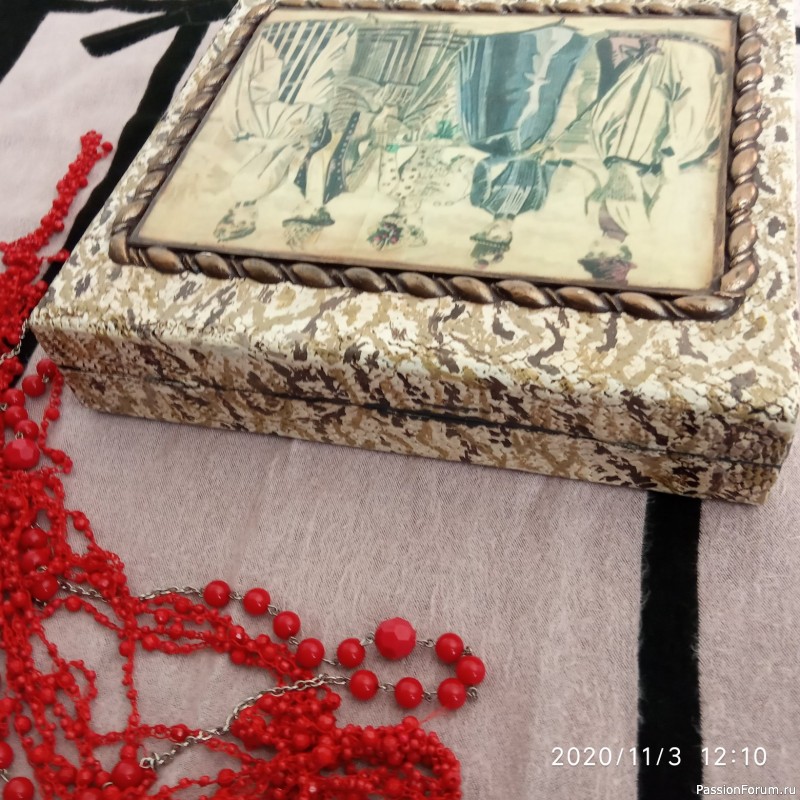 Согласна с Валентиной, когда такие вещи обновляют желательно делать фото до переделки, сразу виден объём работы и есть возможность оценить по достоинству потраченные усилия. Хорошая шкатулка получилась!