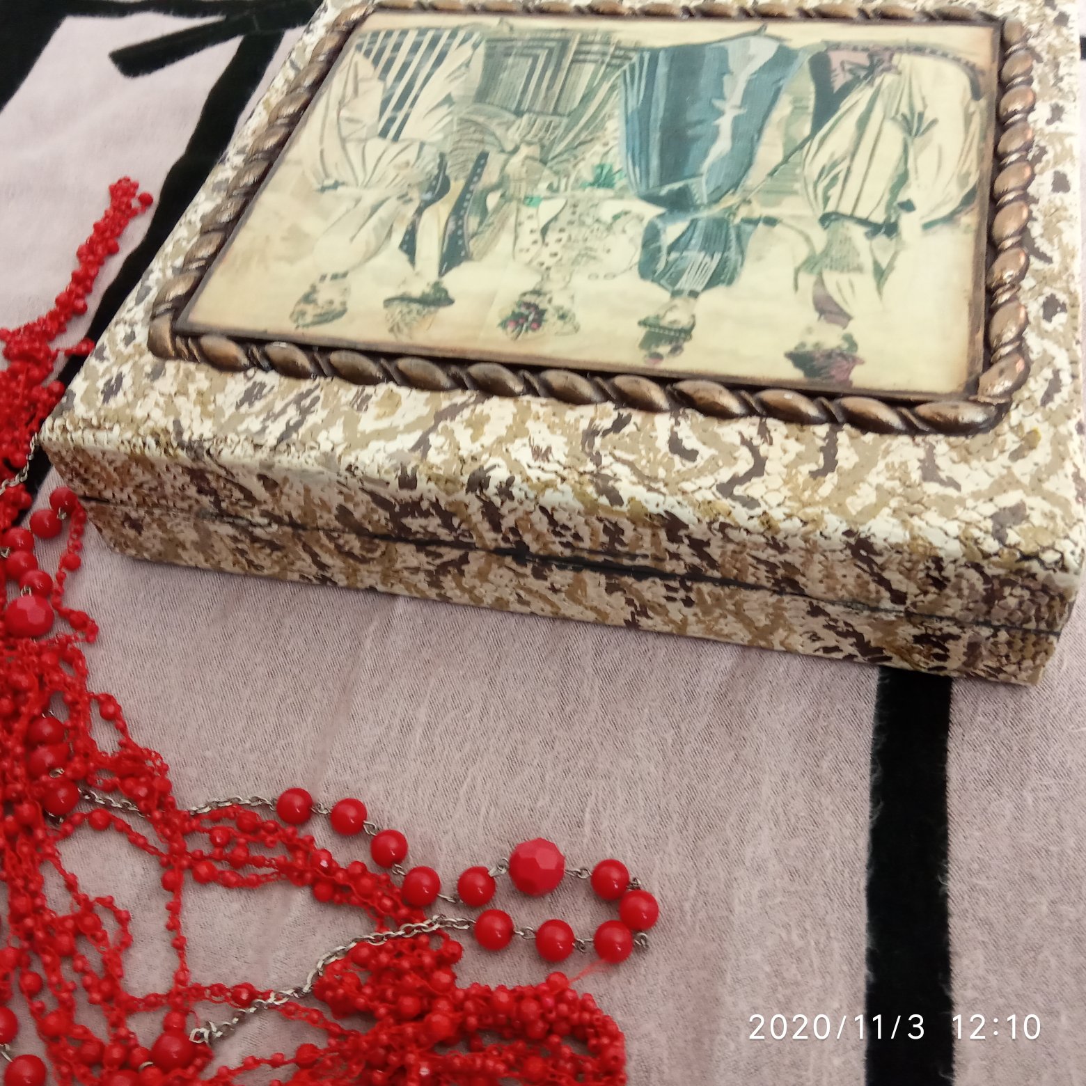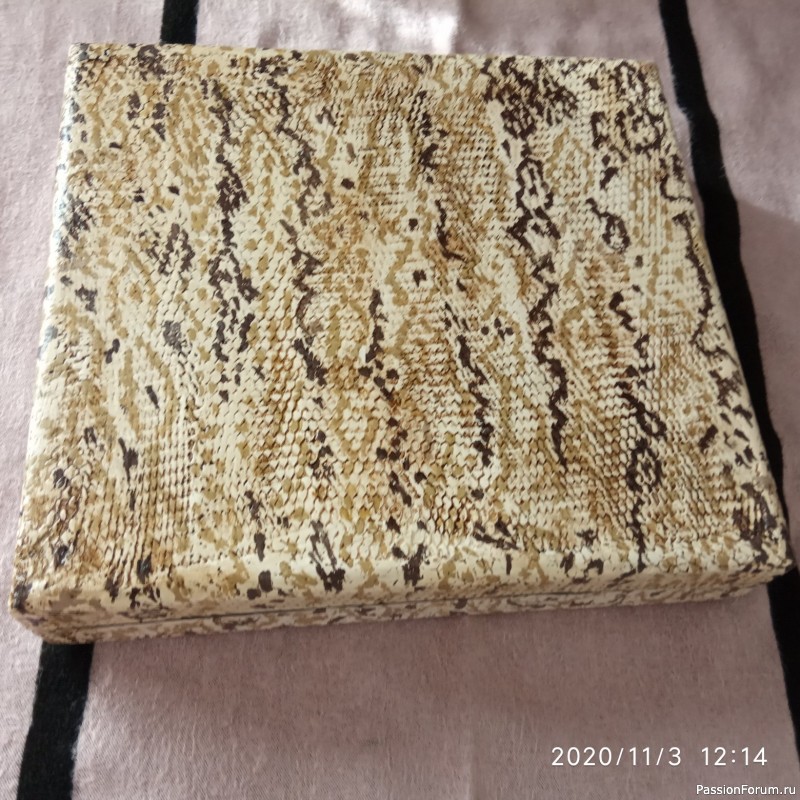 Всем добрый вечер , хочу показать шкатулку для бижутерии , переделанную из старого ,советского футляра для столовых приборов .Может кто то помнит , раньше любили дарить такие наборы на юбилеи , у меня их скопилось несколько штук. Сделала я стилизацию под змеиную кожу .Нанесла шпаклевку через мелкую овощную сетку , покрасила в белый цвет , нанесла рисунок змеиной кожи двумя цветами ,коричневым и черным цветом.Потом все затонировала битумом.На крышке распечатка., косичка из глины. Внутри перегородки из переплетного картона , валики из бигудей,отделка черным фоамираном. Спасибо всем кто просмотрел мою переделку , буду рада любому отзыву.