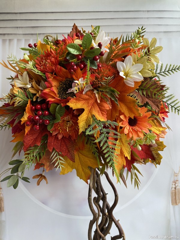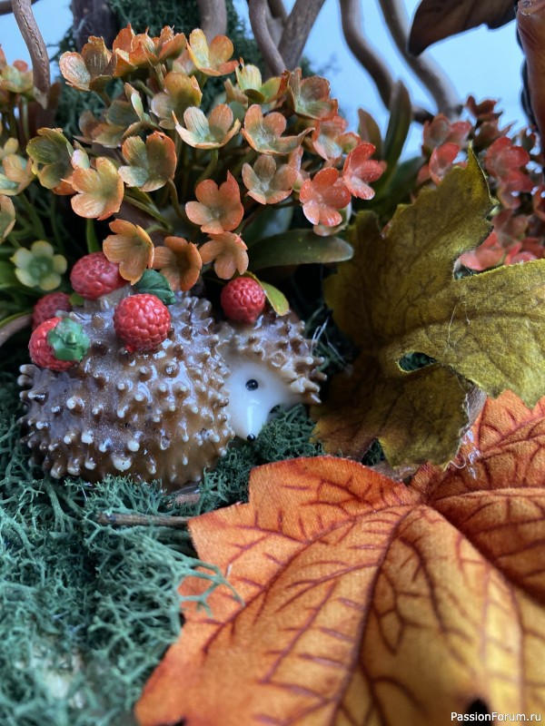 доброго времени суток, Людмила. Листья, цветы искусственные. Мох натуральный стабилизированный. Ветки — это корилус натуральный. То есть мох и ветки натуральные. У нас в городе есть специальные магазины «Бизнес букет» и «Гринвиль». В Леонардо можно купить мох стабилизированный. Основа пенопластовая. Полусфера. Ещё можно материалы приобретать в интернет-магазинах. Я часто пользуюсь Ярмаркой Мастеров. Магазин такой. Там можно многое купить.