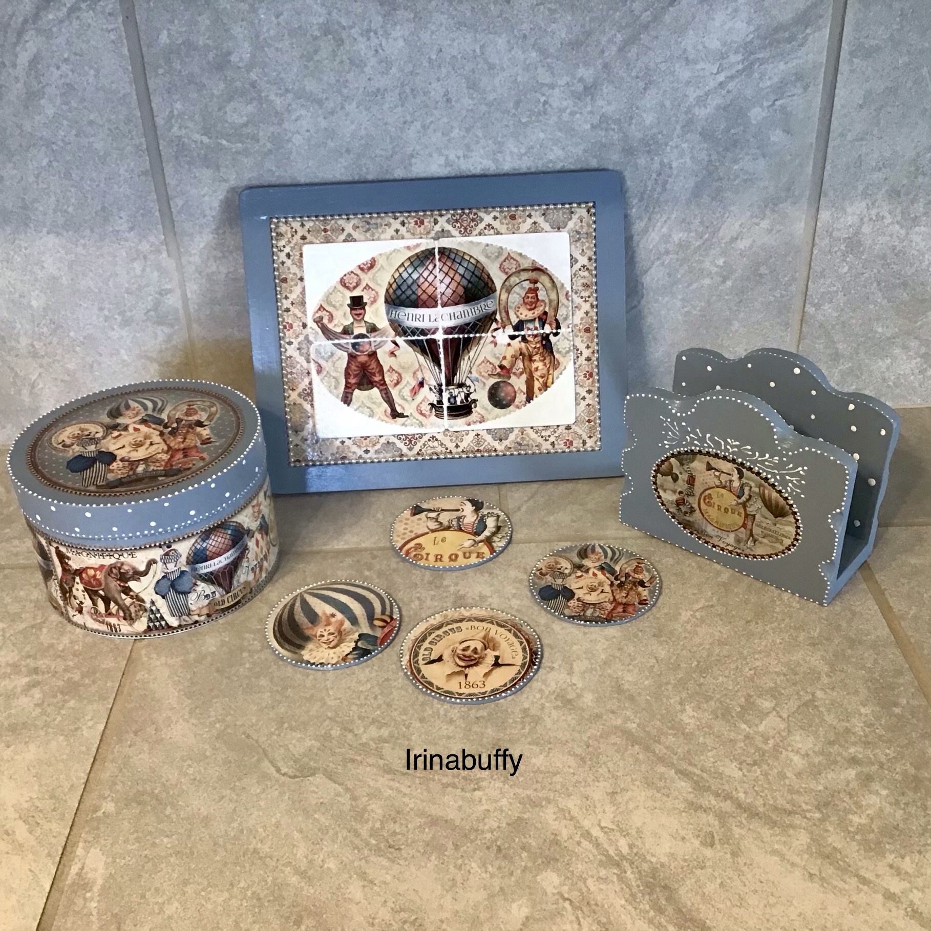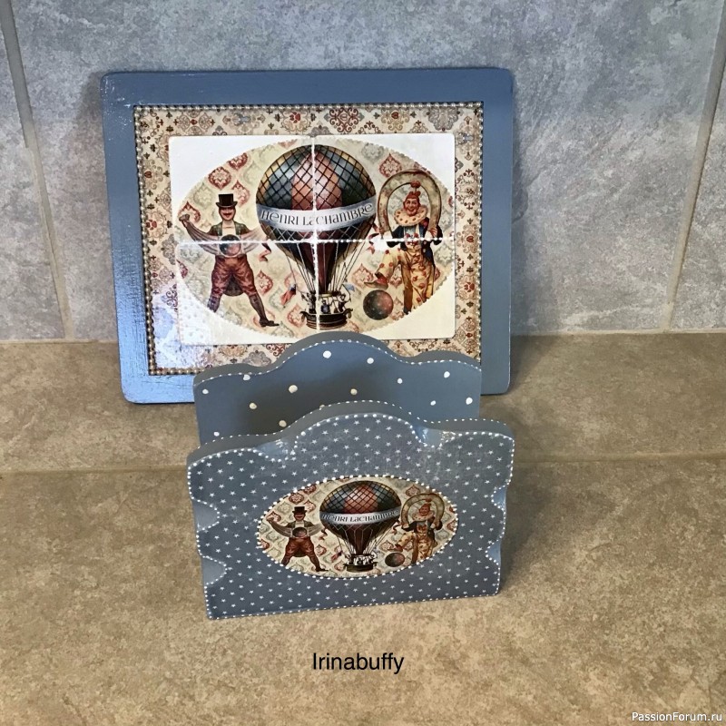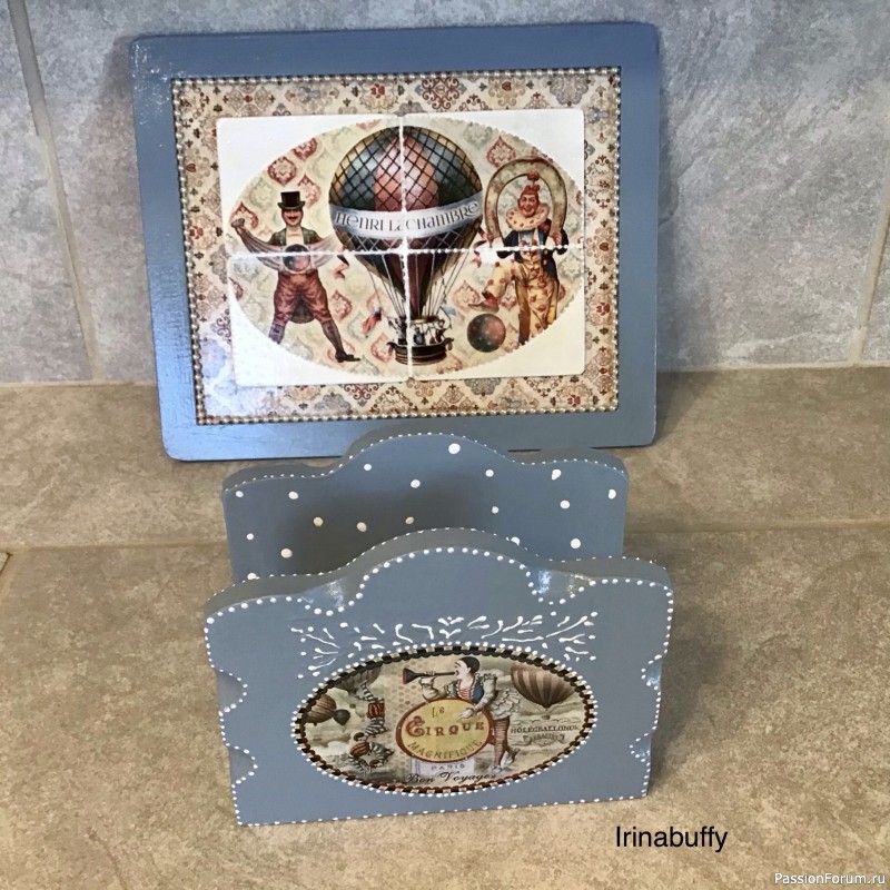Ирочка. Восхительные работы. Любуюсь второй день, есть что рассматривать: и обалденные рисунки на распечатках, и качество работы ( как всегда на высочайшем уровне), и идея воплощения. Очень понравилось сочетание распечатки и трафарета на салфетнице. Ты большая умница, Ирочка.