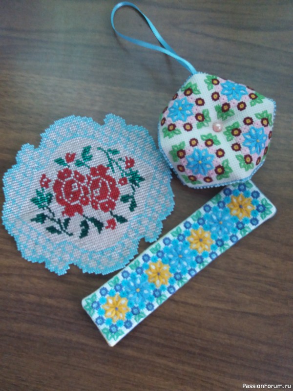 Закладка и бискорню вышиты (стежочки такие меленькие, аккуратненькие), а салфеточка сплетена из бисера.