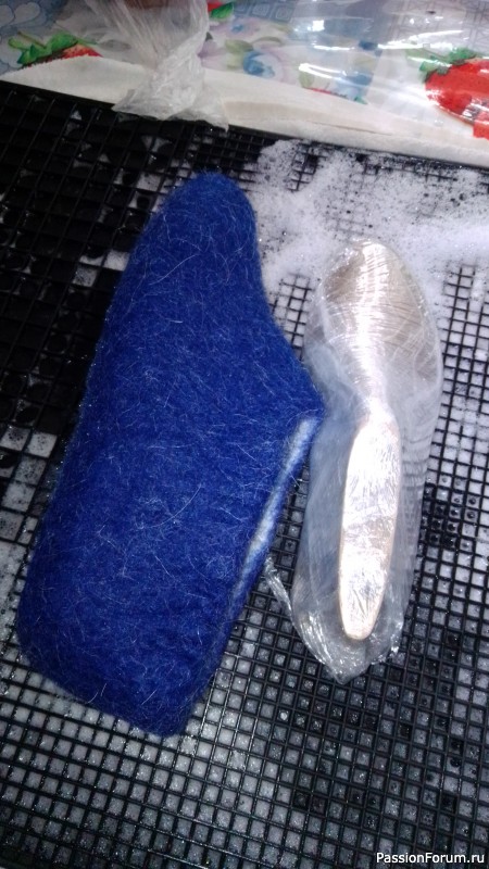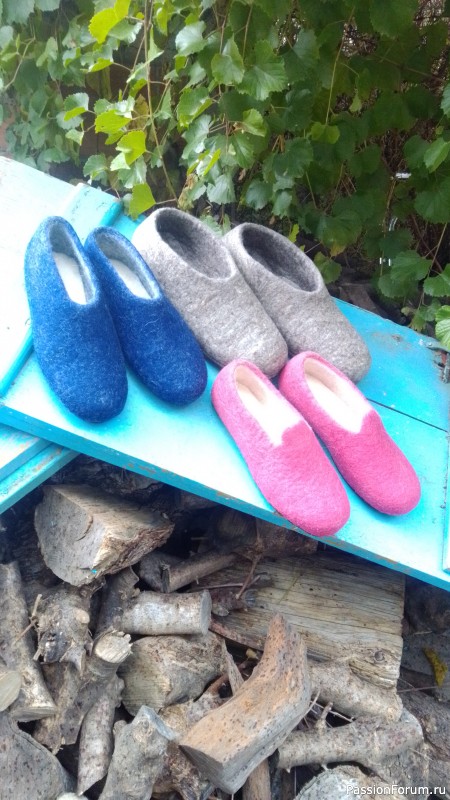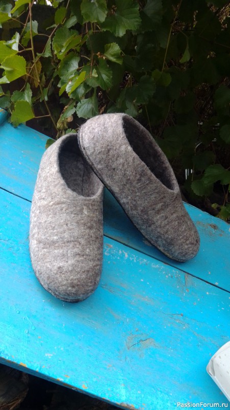 Ужаснулась, попросила эту шерсть не выбрасывать, идей, что мне с нею делать ещё не было. Но потом мне попались на глаза валяные тапочки. Путь был не быстрым. И вот его результат.